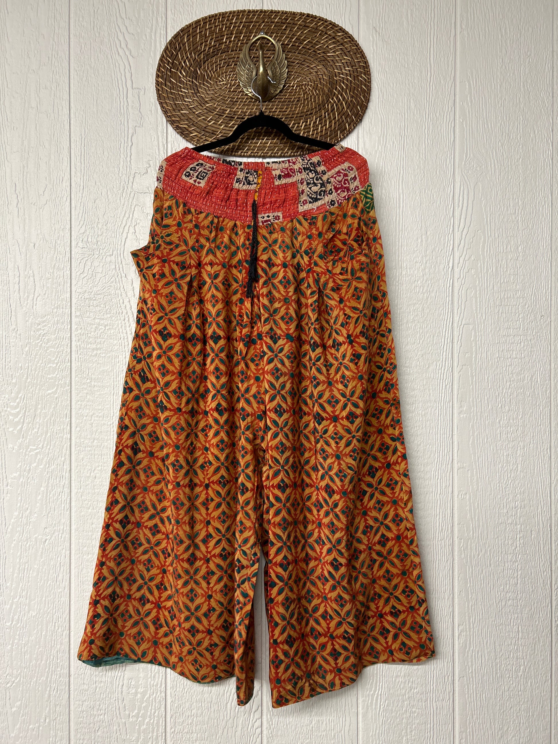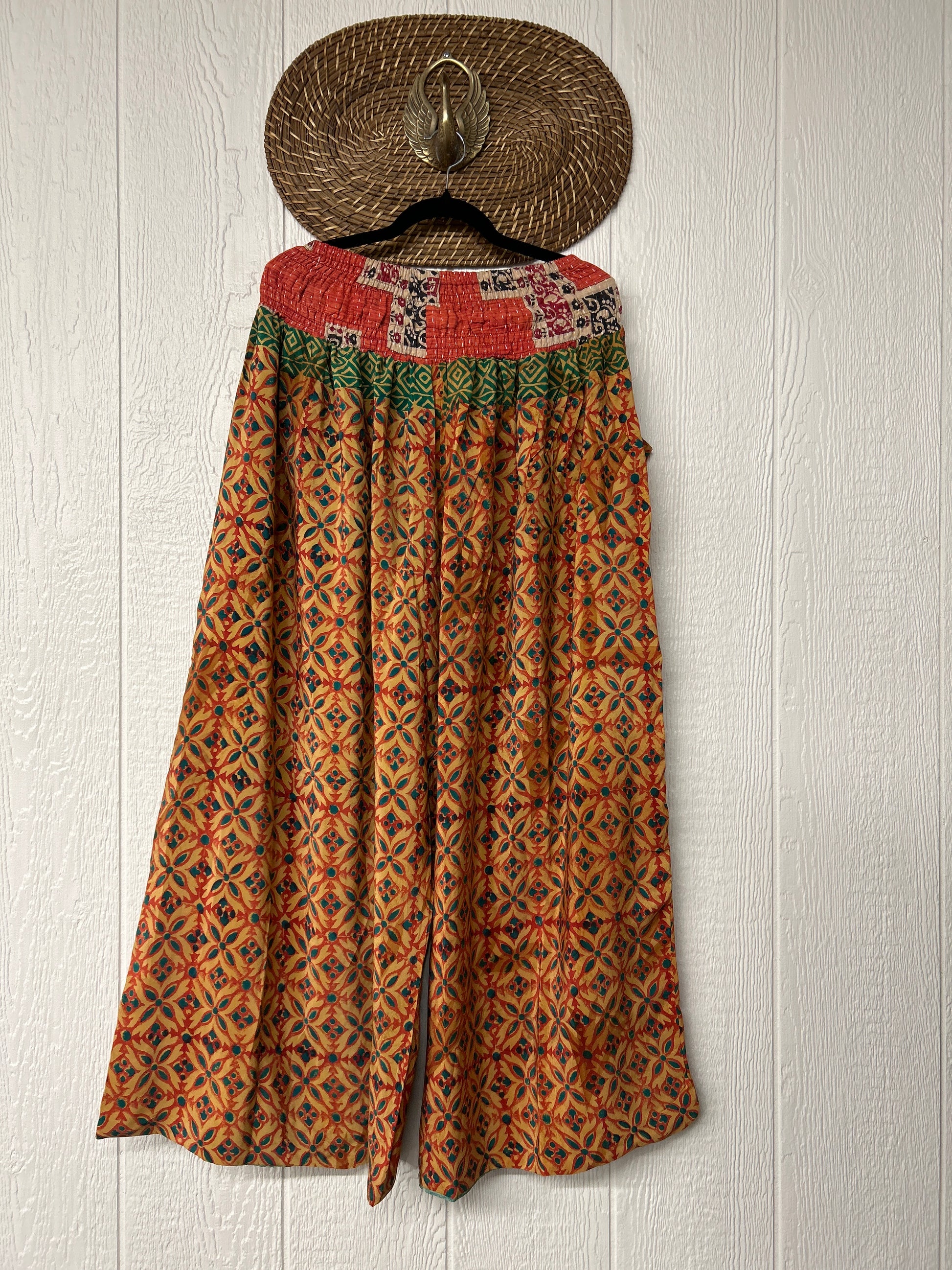 Crafted from vintage double crepe sari these pants feature wide legs, pleating, exterior and interior pockets making them fully reversible, and a stretchy waistband with a drawstring.