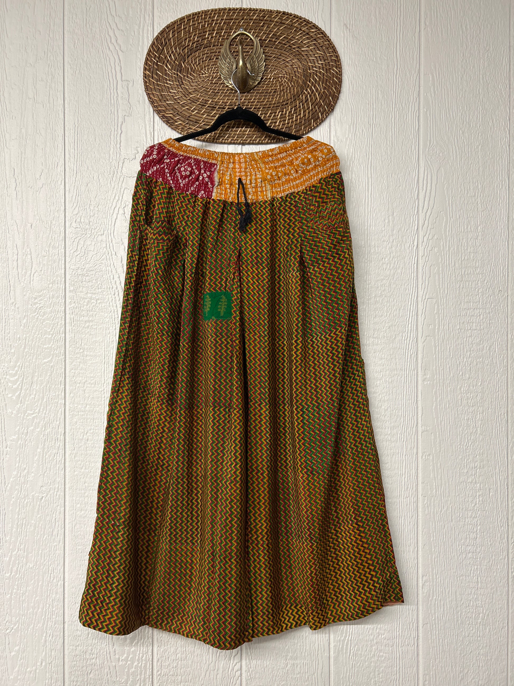 Crafted from vintage double crepe sari these pants feature wide legs, pleating, exterior and interior pockets making them fully reversible, and a stretchy waistband with a drawstring.
