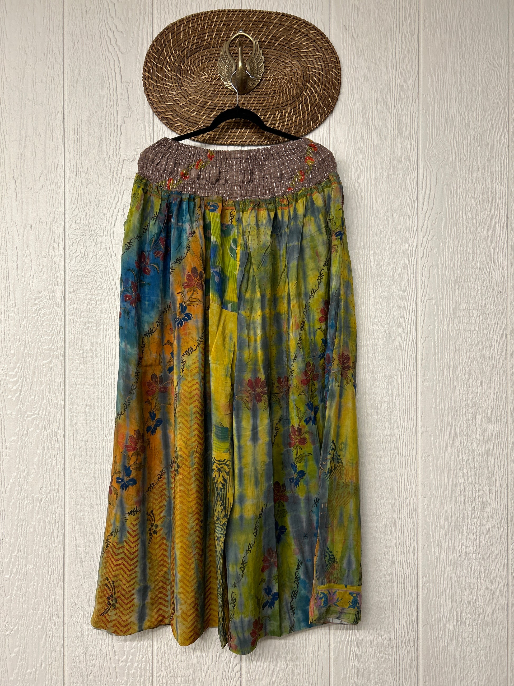 Crafted from vintage double crepe sari these pants feature wide legs, pleating, exterior and interior pockets making them fully reversible, and a stretchy waistband with a drawstring.
