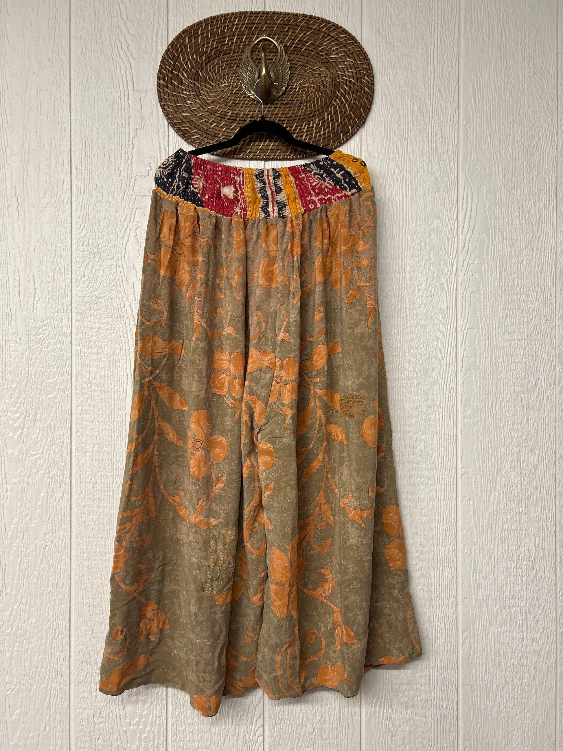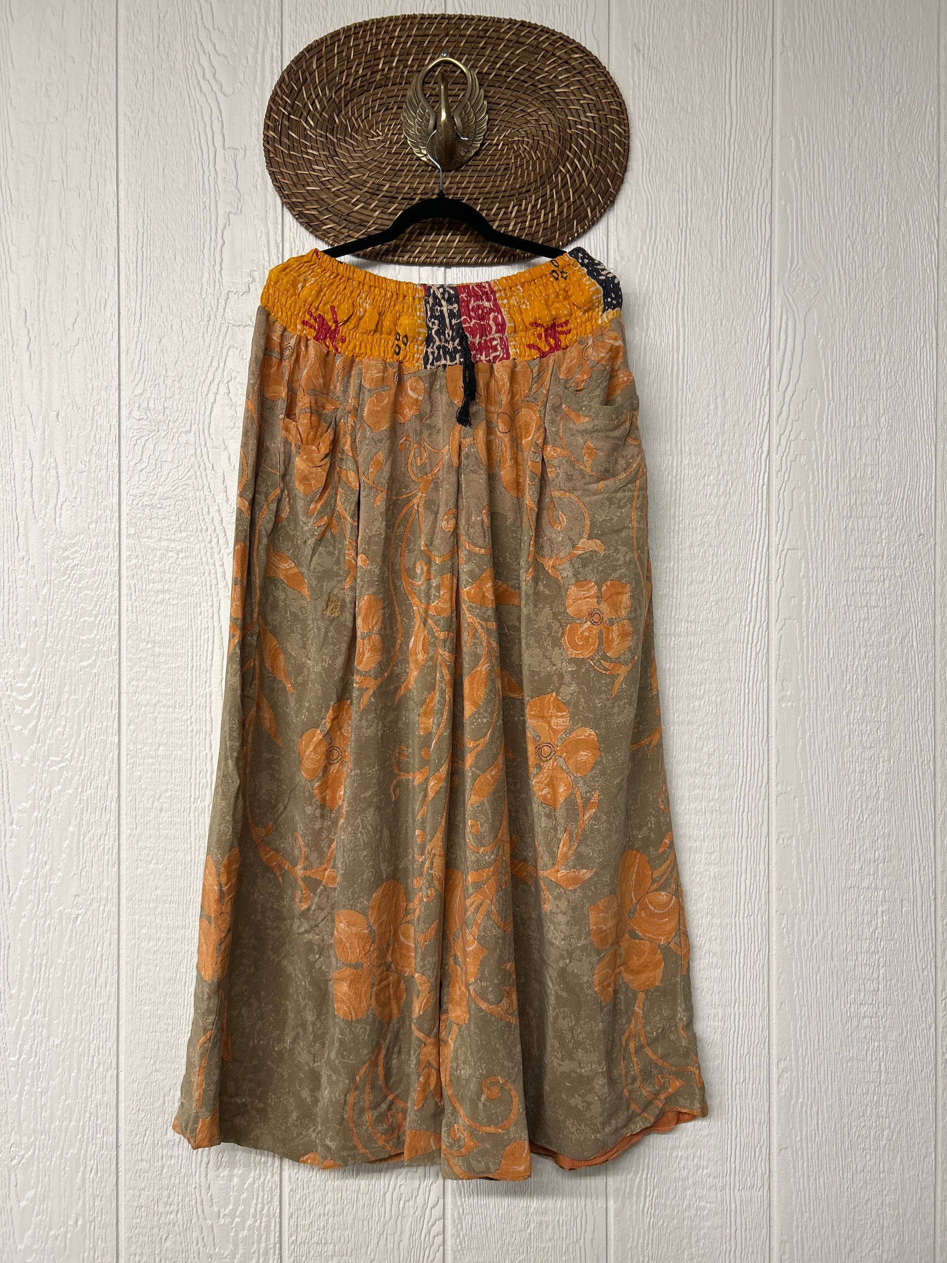 Crafted from vintage double crepe sari these pants feature wide legs, pleating, exterior and interior pockets making them fully reversible, and a stretchy waistband with a drawstring.