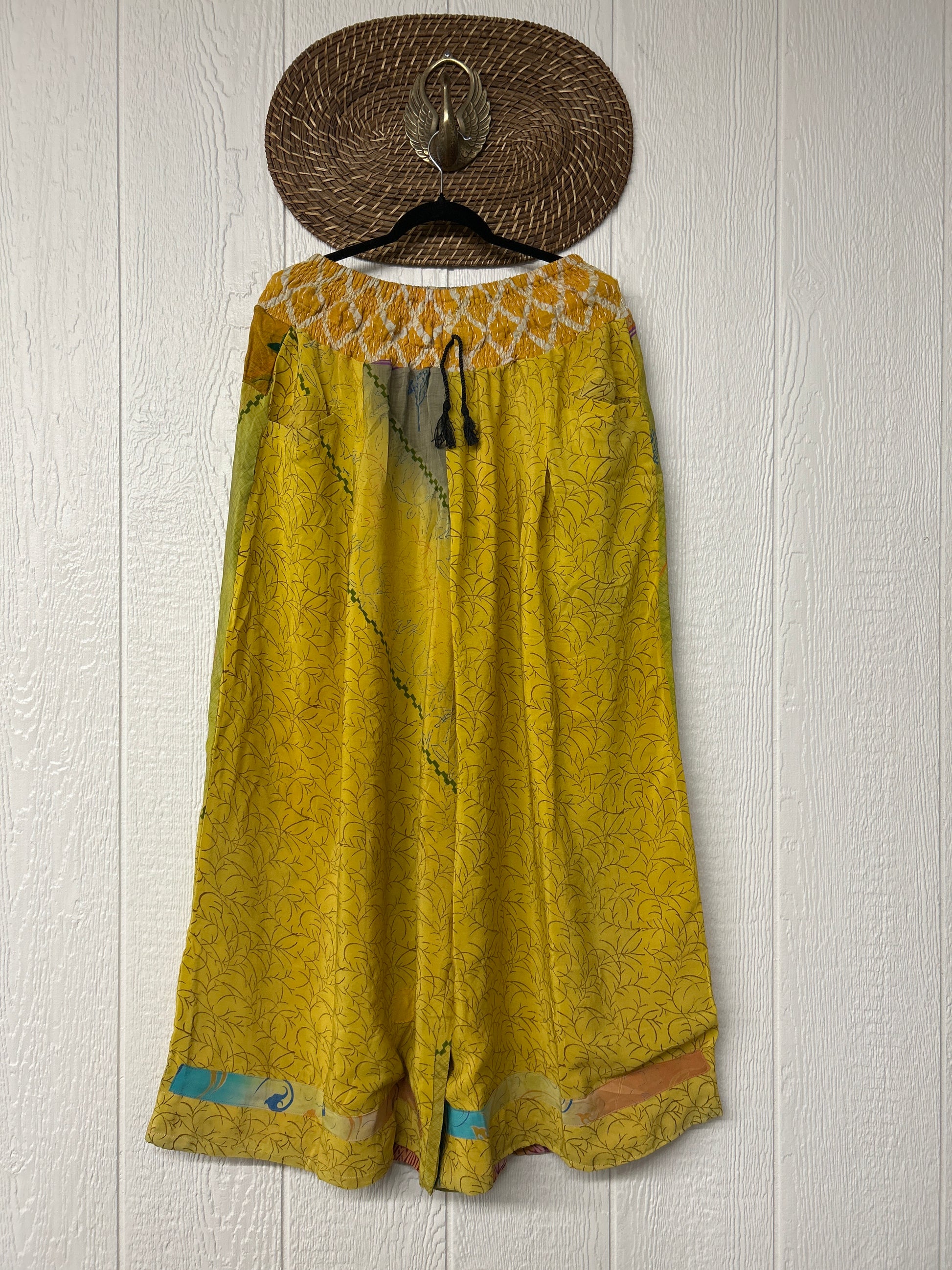 Crafted from vintage double crepe sari these pants feature wide legs, pleating, exterior and interior pockets making them fully reversible, and a stretchy waistband with a drawstring.