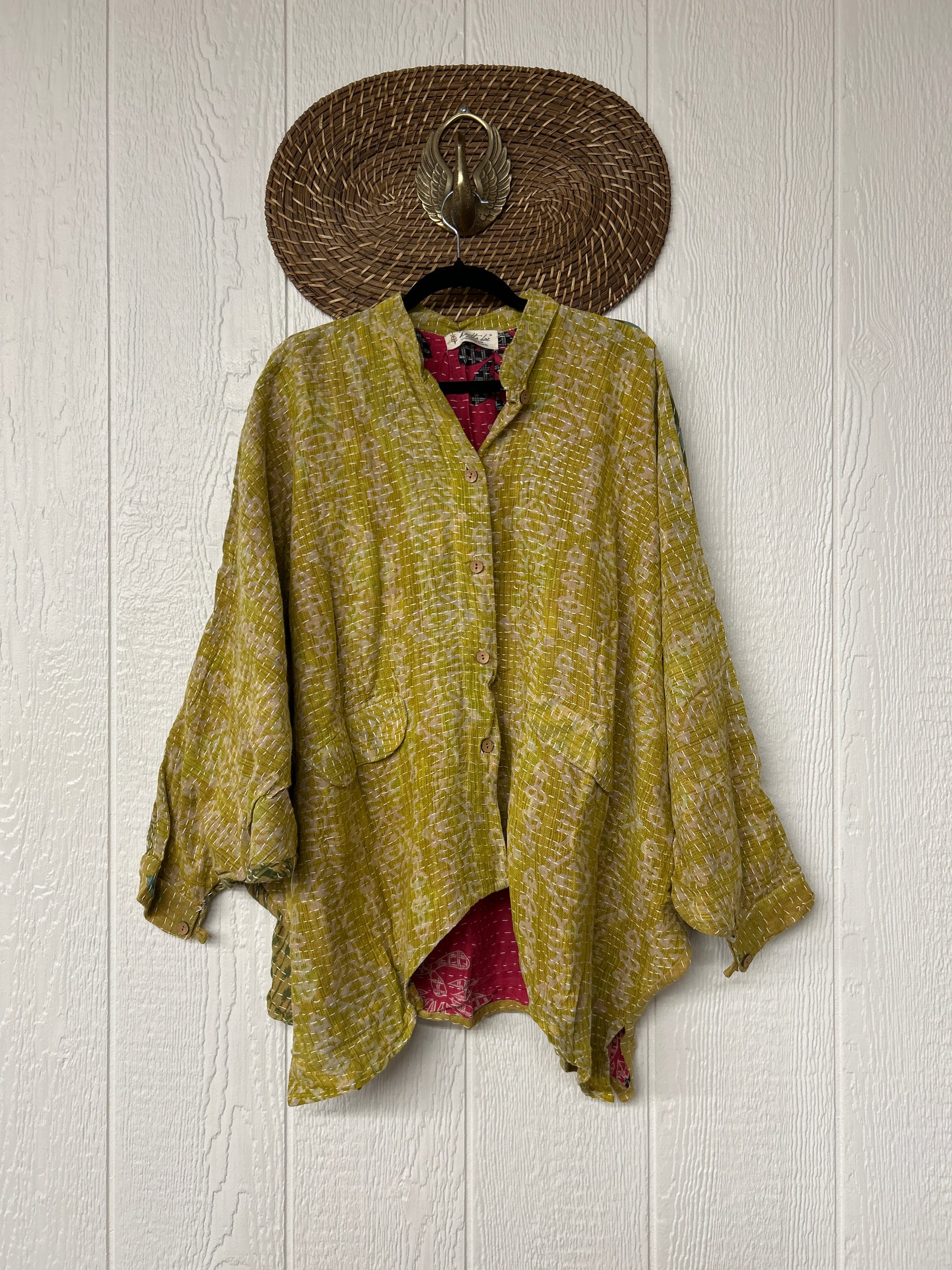 that features coconut buttons down the front and on the cuff, dropped shoulders with long sleeves and deep pockets.