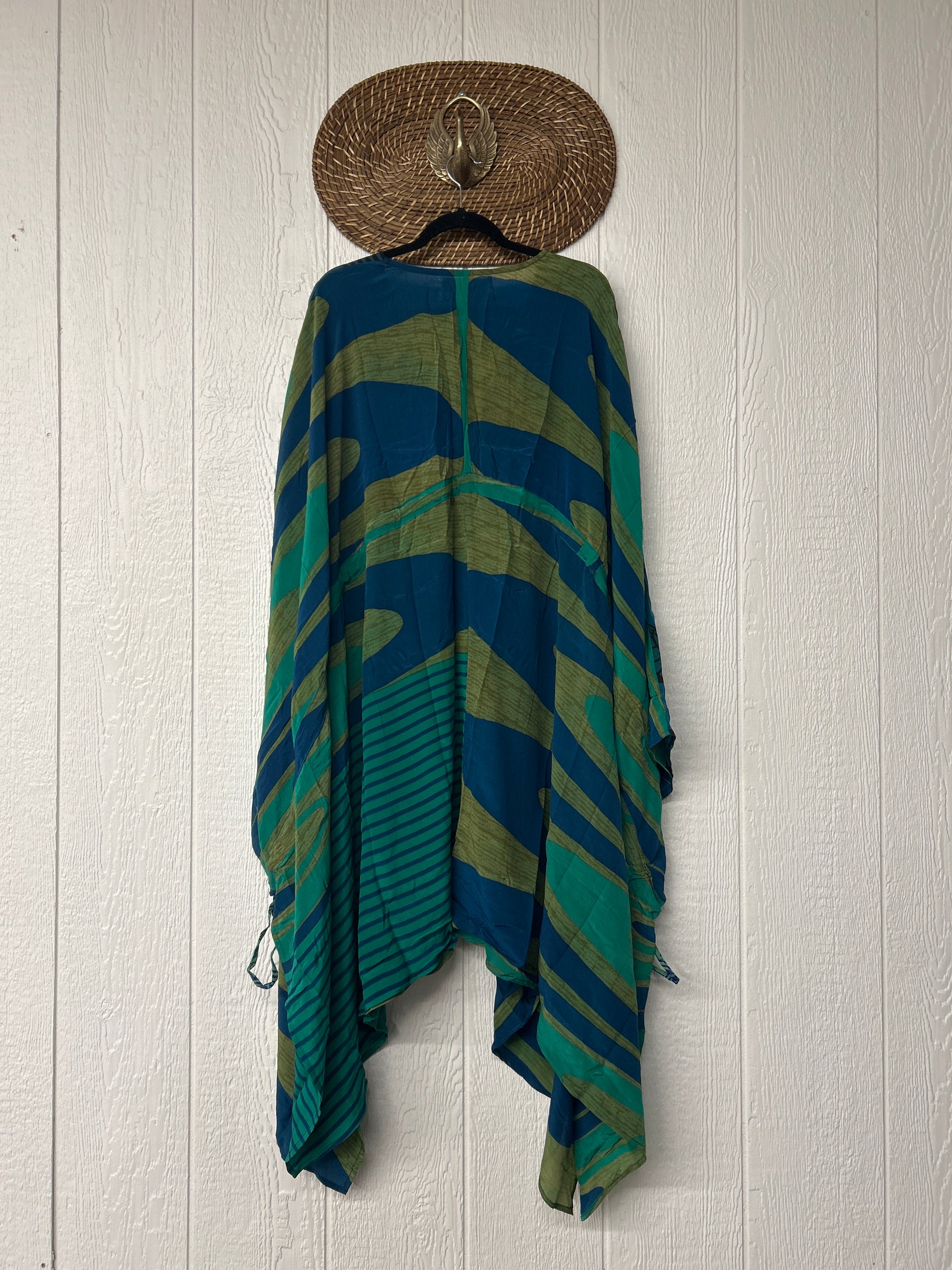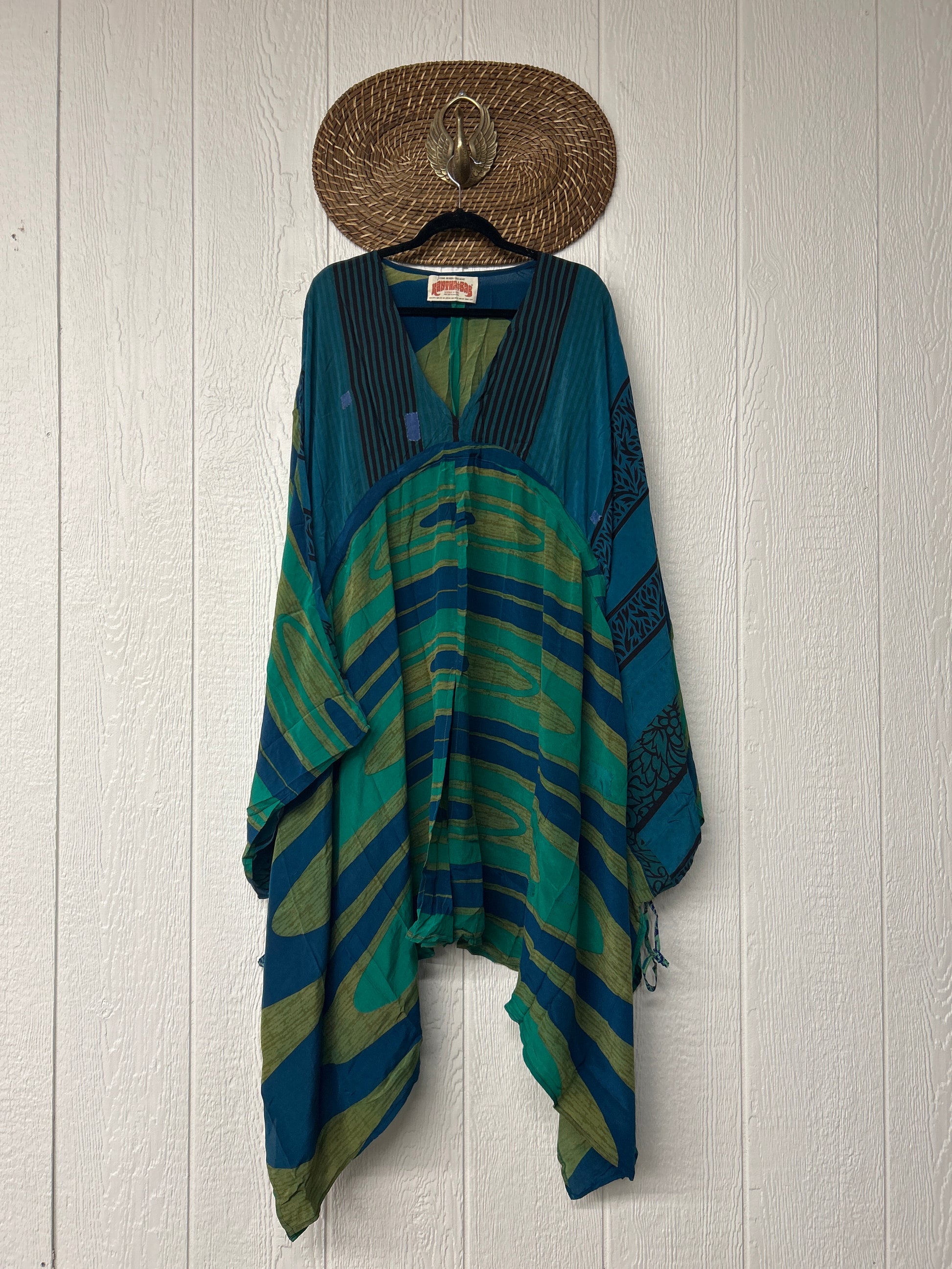 Fabrics may have small threads or holes in the layers. Color inconsistency or small stains may be present. The saris are sewn together and extend the life of each design.