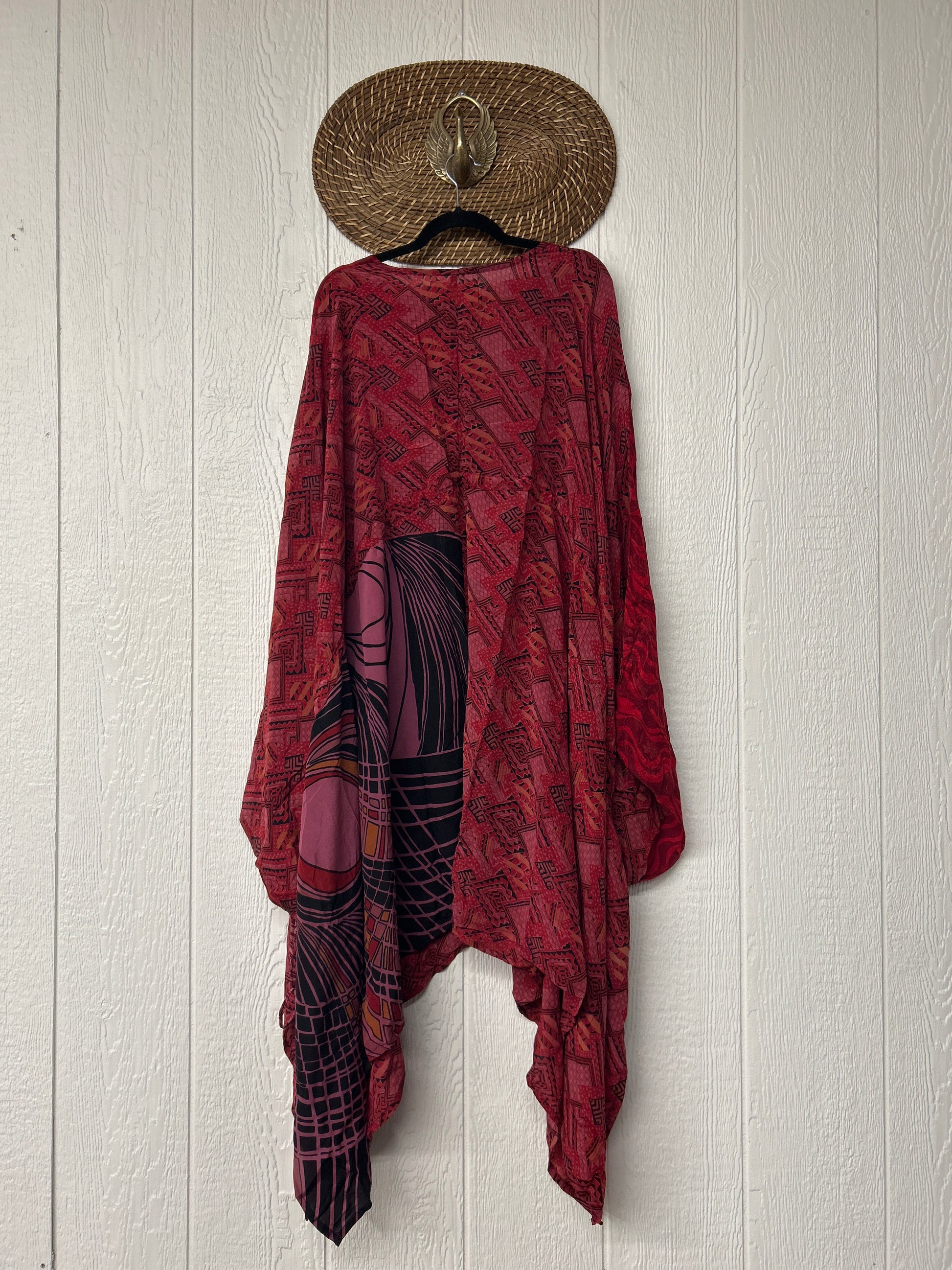 Fabrics may have small threads or holes in the layers. Color inconsistency or small stains may be present. The saris are sewn together and extend the life of each design.