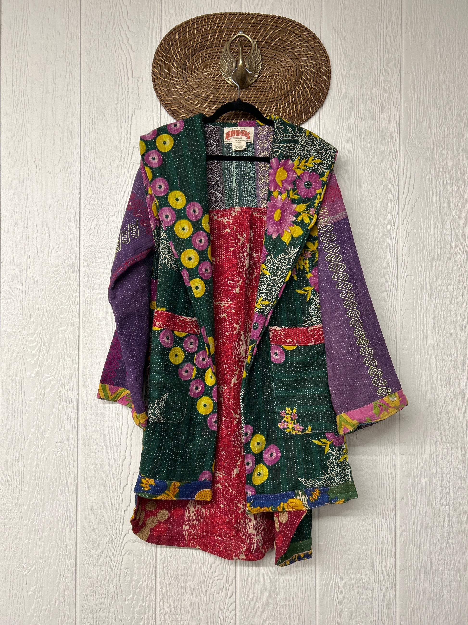 Made from vintage fine kantha embroidered cotton sari this coat features a shawl collar and deep exterior pockets.