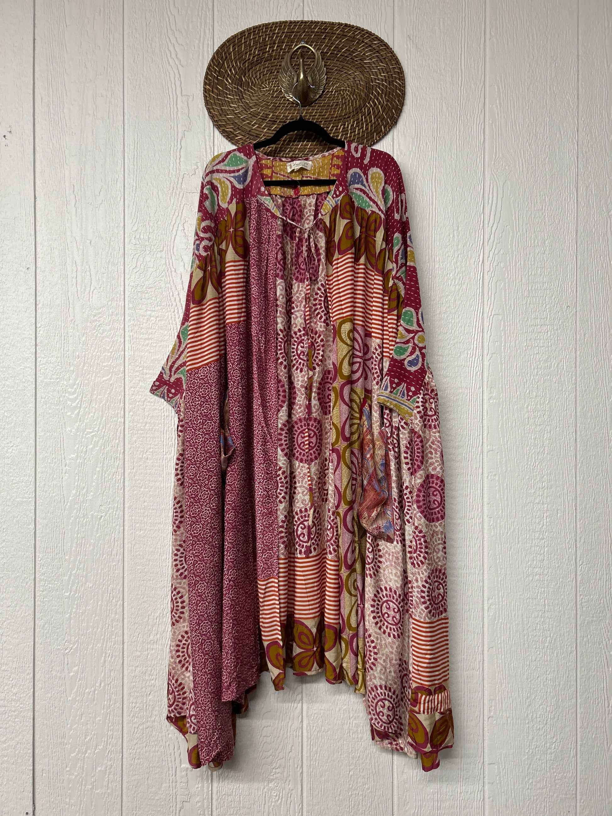 Twirl around to your heart's delight in our new Fleetwood Kimono. This floaty dream is a divine mix of our ultra lux Kantha embroidered vintage cotton and rasgulla sari. Features a tie neck closure and slouchy exterior pockets.