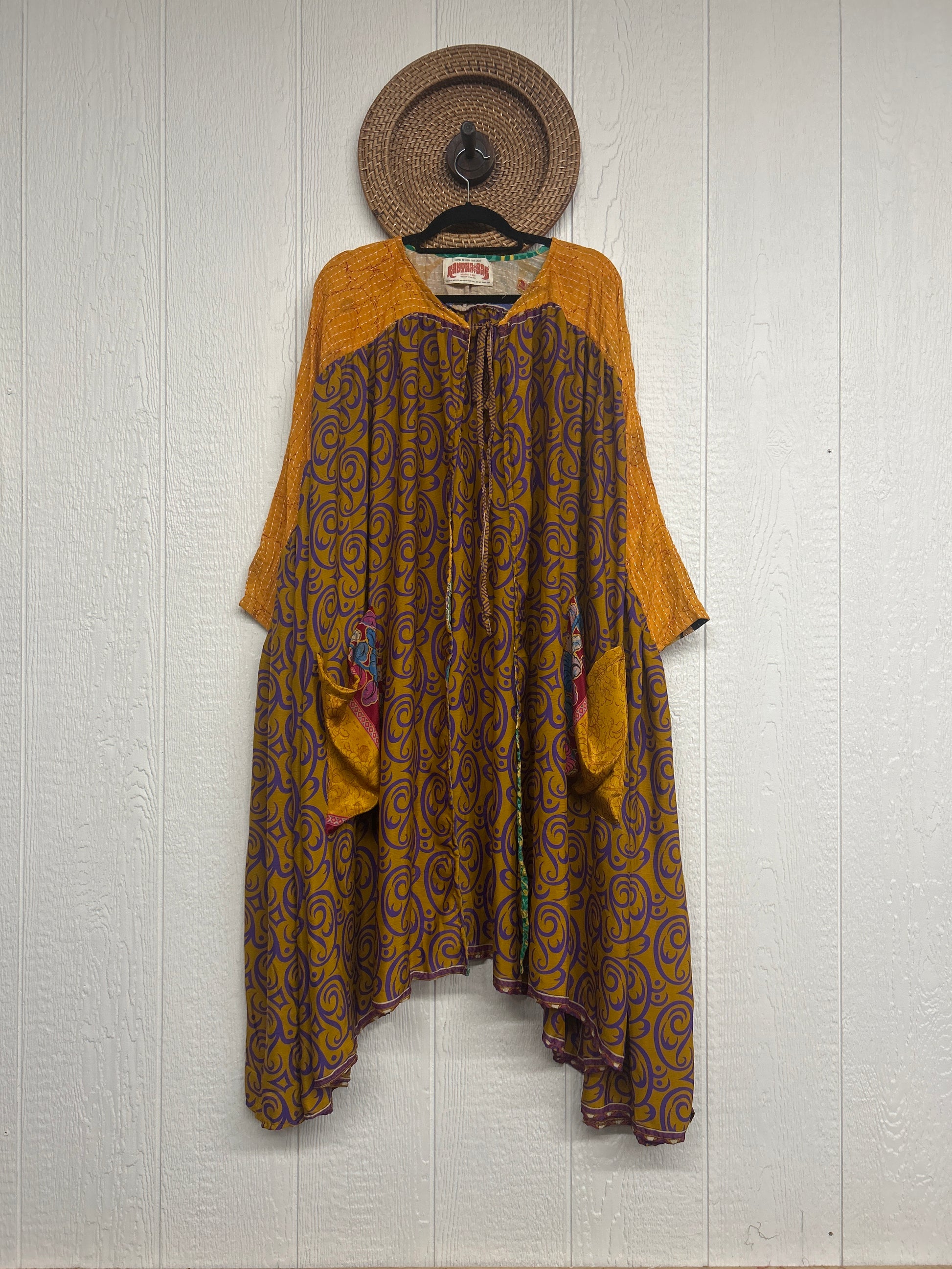 Twirl around to your heart's delight in our new Fleetwood Kimono. This floaty dream is a divine mix of our ultra lux Kantha embroidered vintage cotton and rasgulla sari. Features a tie neck closure and slouchy exterior pockets.