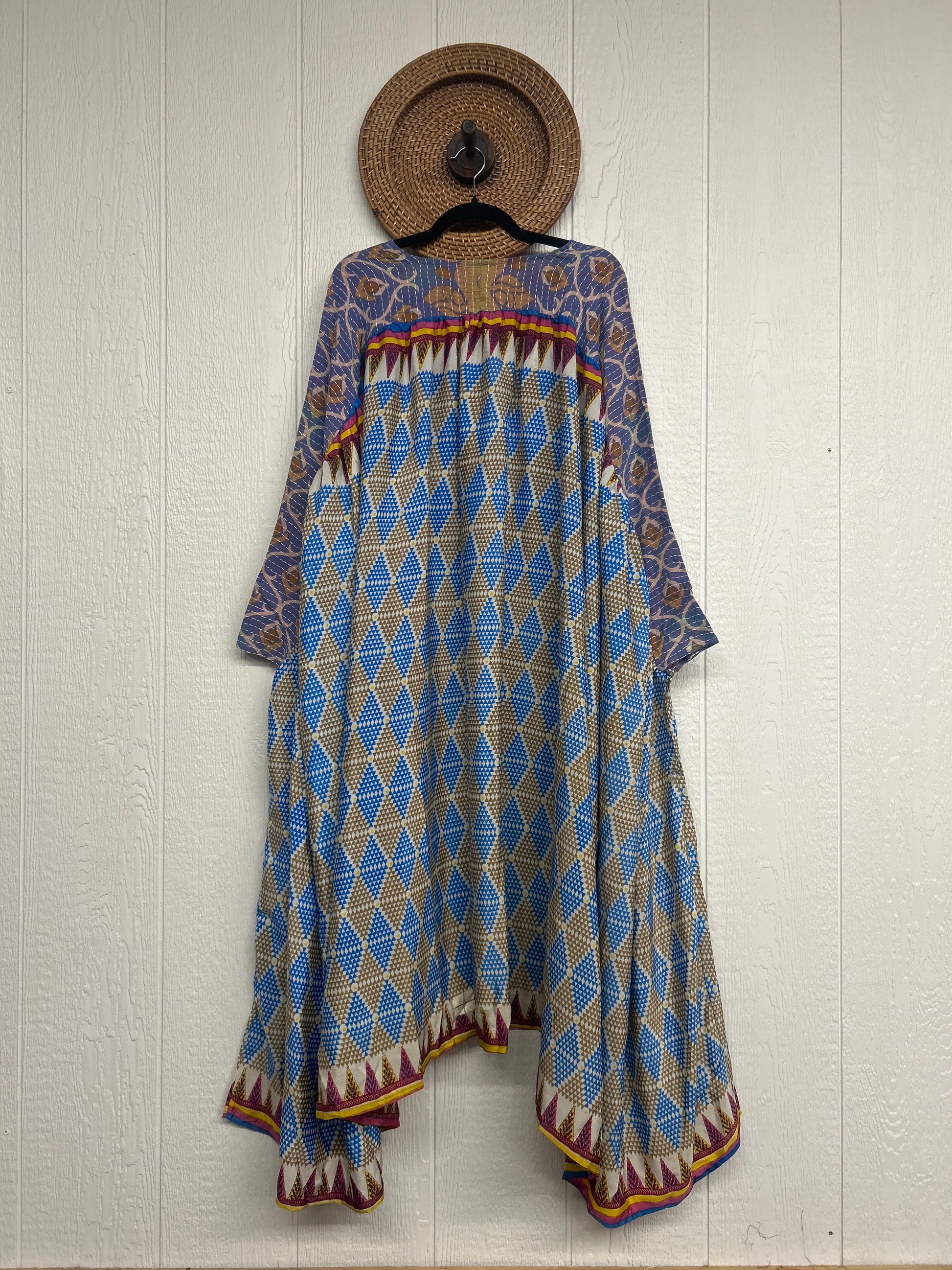 Twirl around to your heart's delight in our new Fleetwood Kimono. This floaty dream is a divine mix of our ultra lux Kantha embroidered vintage cotton and rasgulla sari. Features a tie neck closure and slouchy exterior pockets.