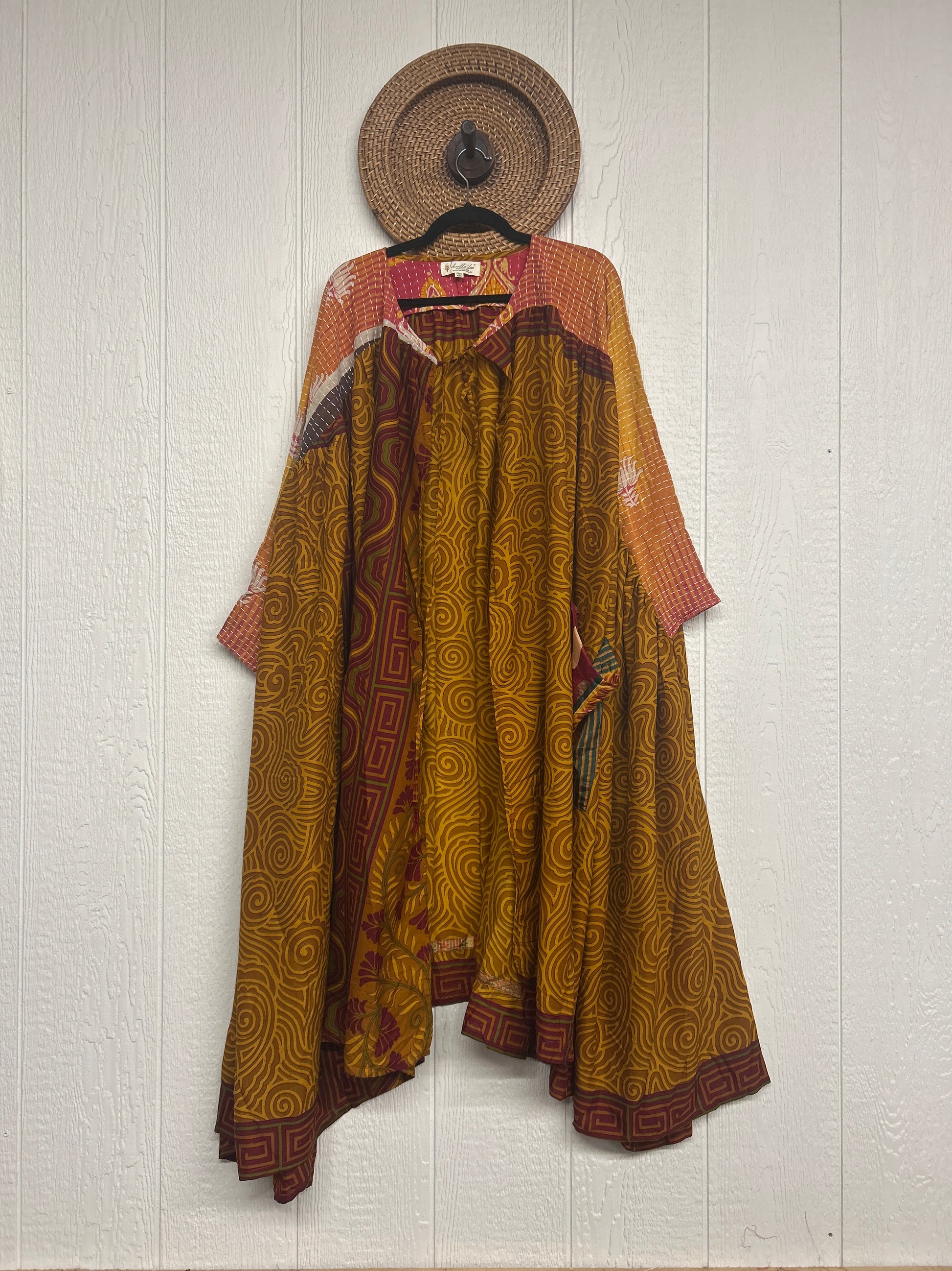 Twirl around to your heart's delight in our new Fleetwood Kimono. This floaty dream is a divine mix of our ultra lux Kantha embroidered vintage cotton and rasgulla sari. Features a tie neck closure and slouchy exterior pockets.