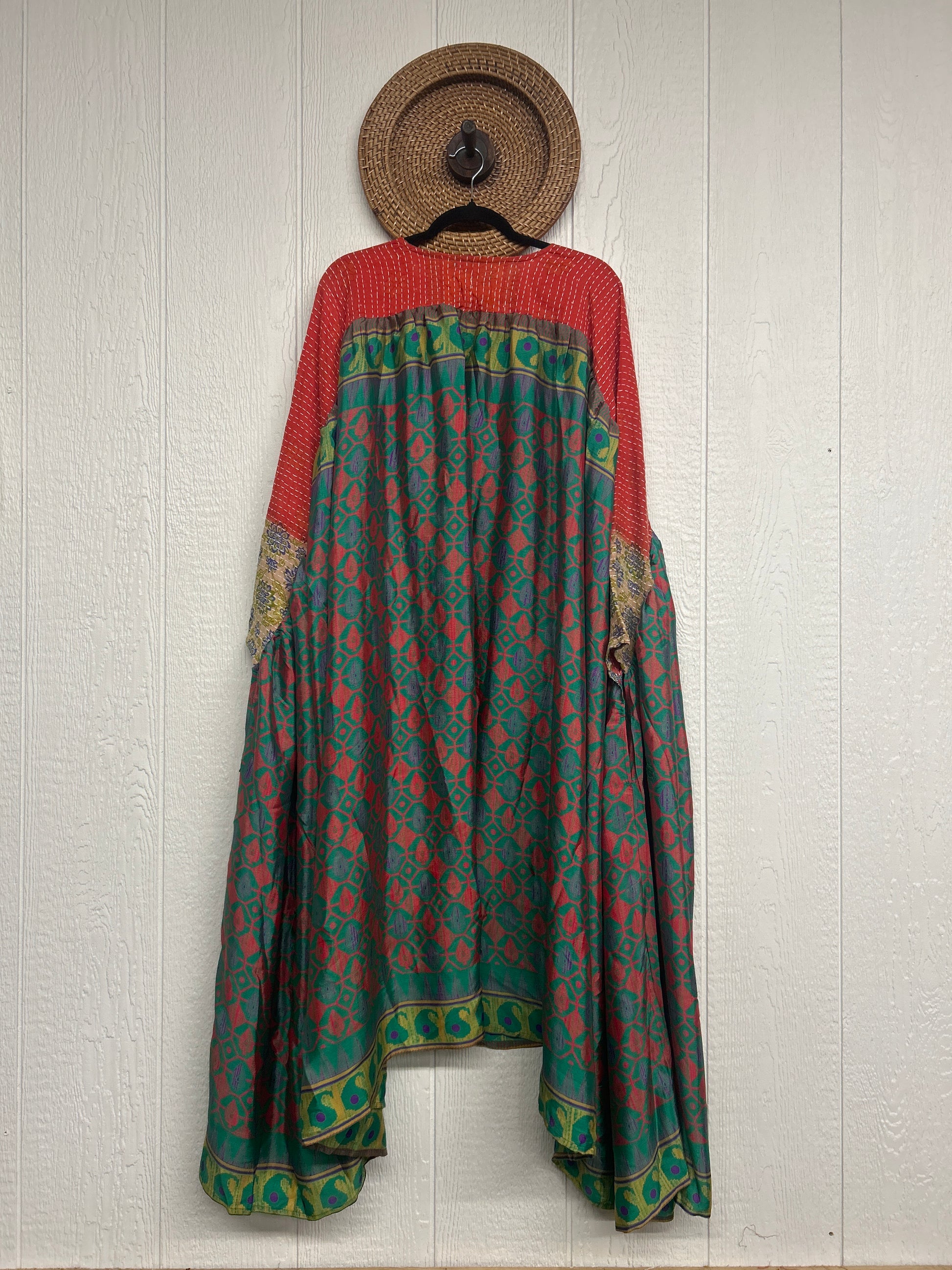 Twirl around to your heart's delight in our new Fleetwood Kimono. This floaty dream is a divine mix of our ultra lux Kantha embroidered vintage cotton and rasgulla sari. Features a tie neck closure and slouchy exterior pockets.