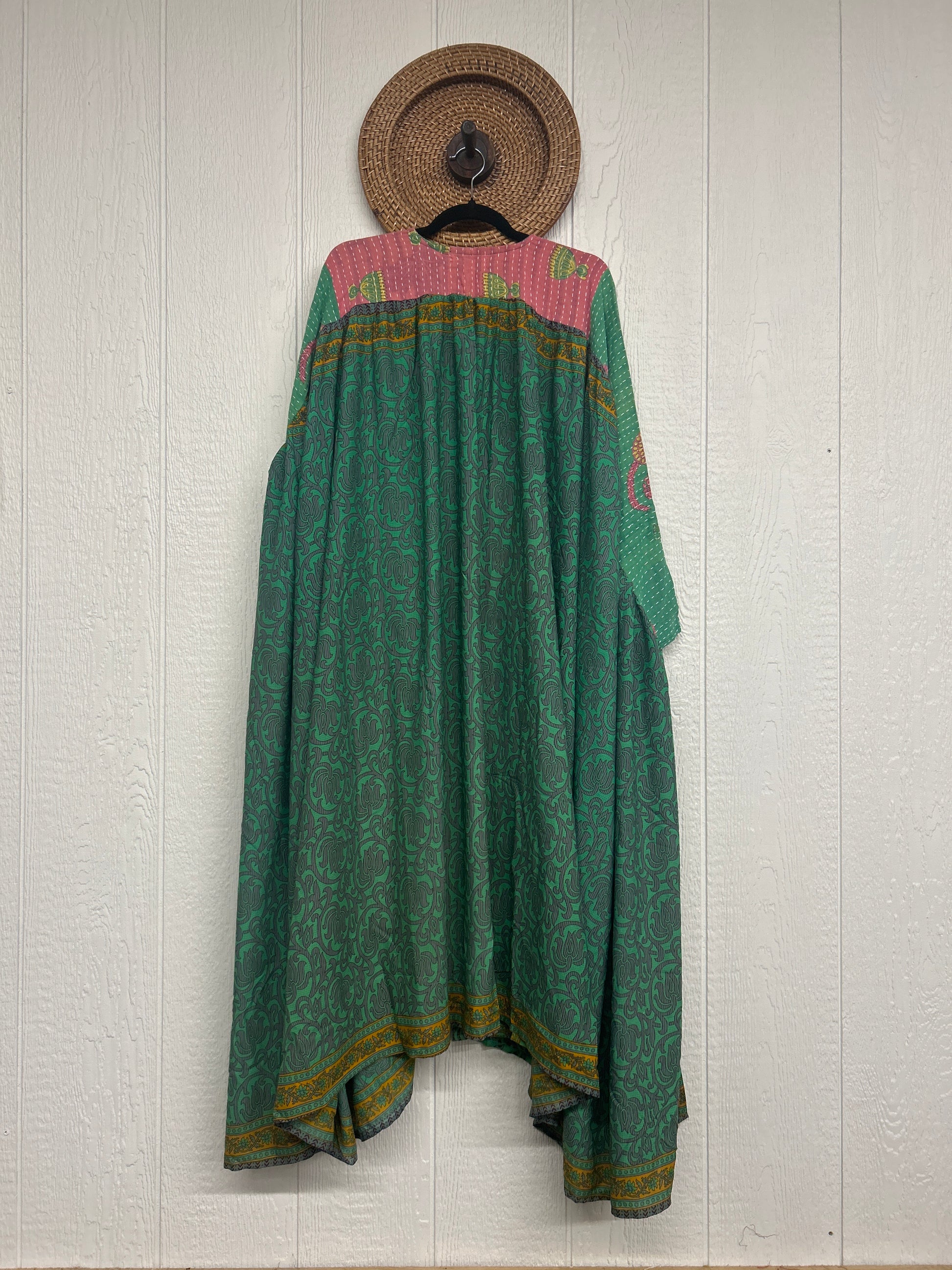 Twirl around to your heart's delight in our new Fleetwood Kimono. This floaty dream is a divine mix of our ultra lux Kantha embroidered vintage cotton and rasgulla sari. Features a tie neck closure and slouchy exterior pockets.