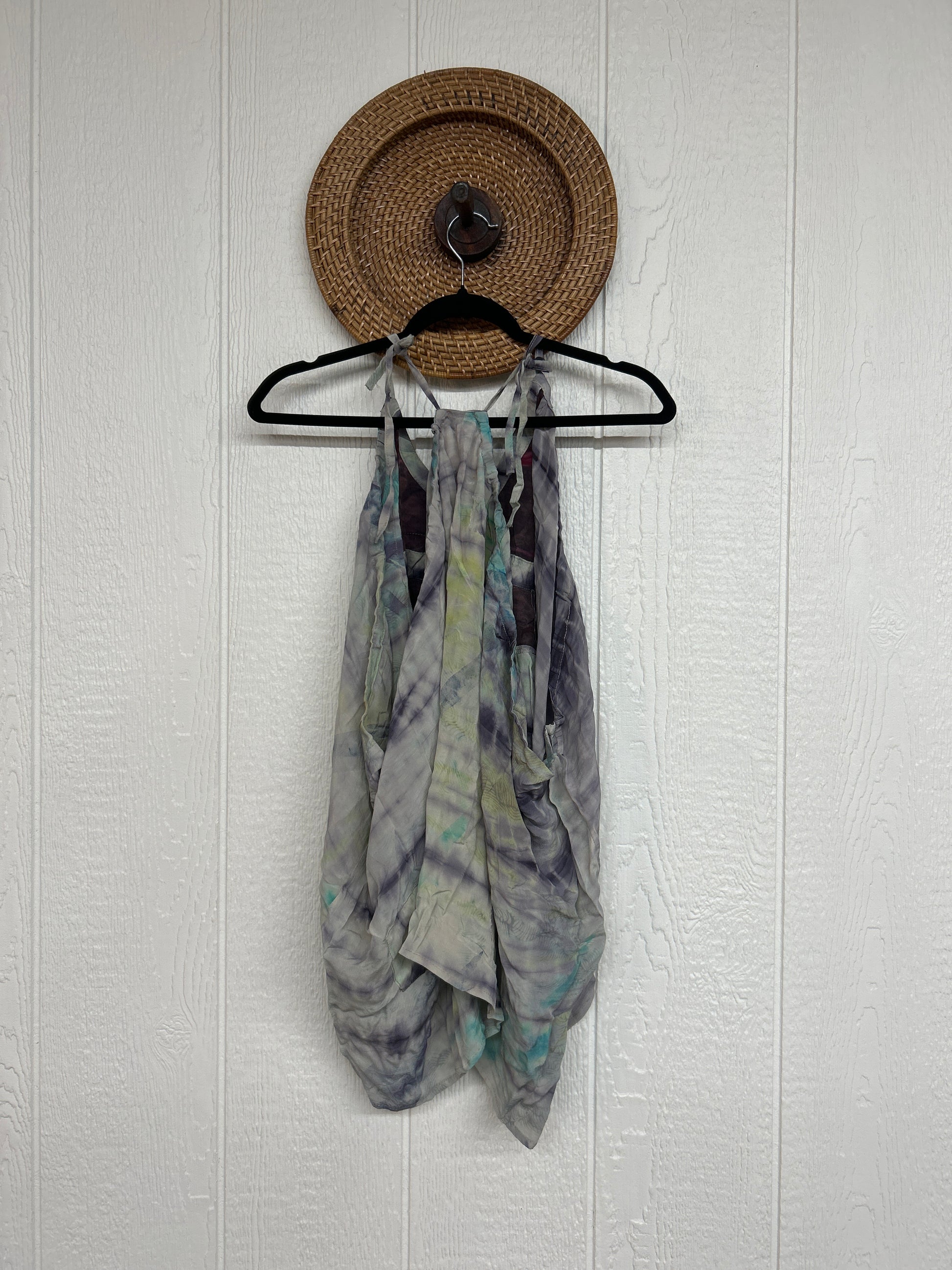 The perfect layering piece made from vintage crepe silk sari. Features tie straps that also cinch for customization.
