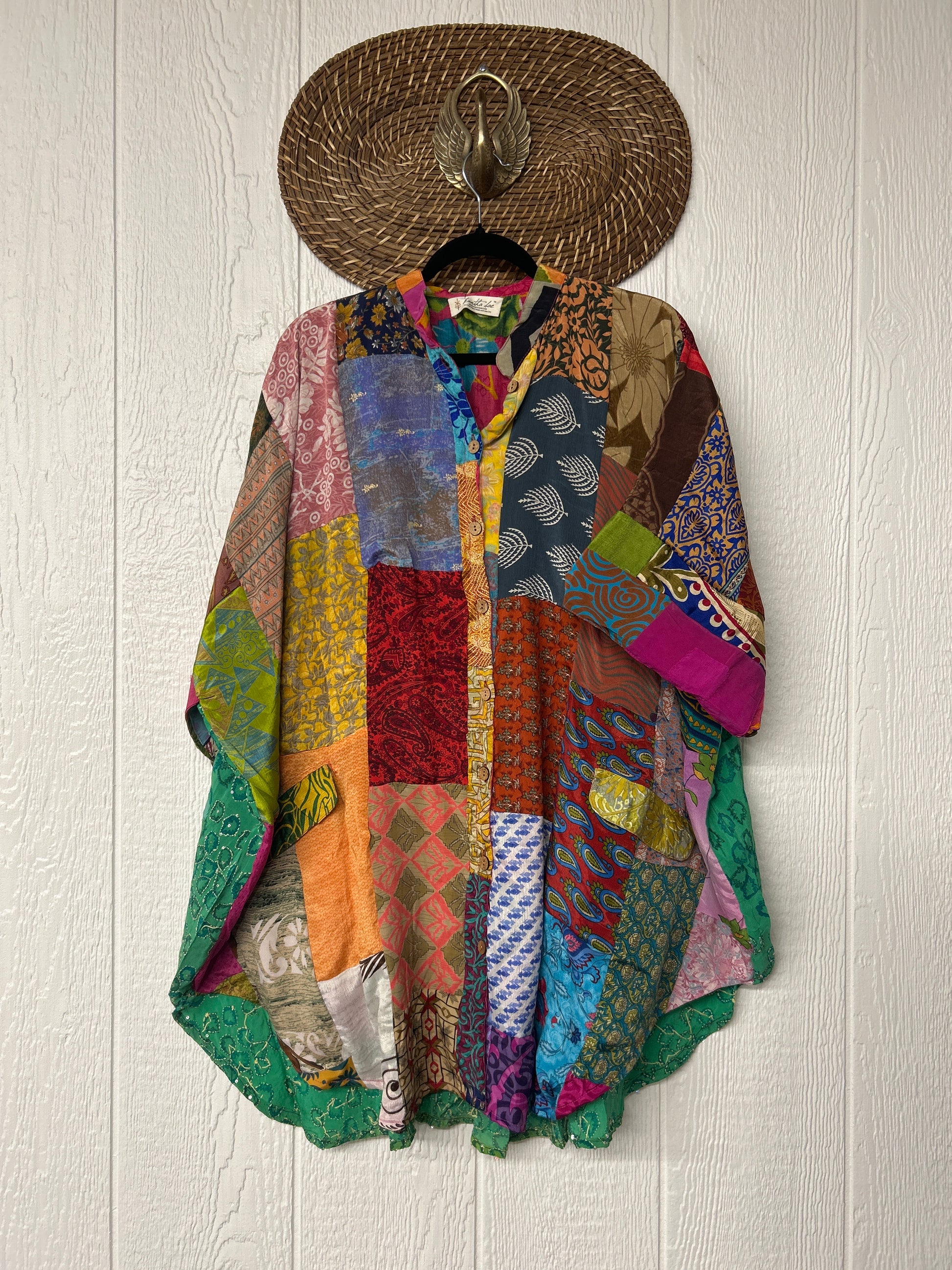 Made from hand-stitched patchwork vintage crepe sari, this billowy dream is fully lined in the front with cotton sari. Features a crepe panel in the back, functional buttons, two slouchy pockets in the front, and a curved bottom.