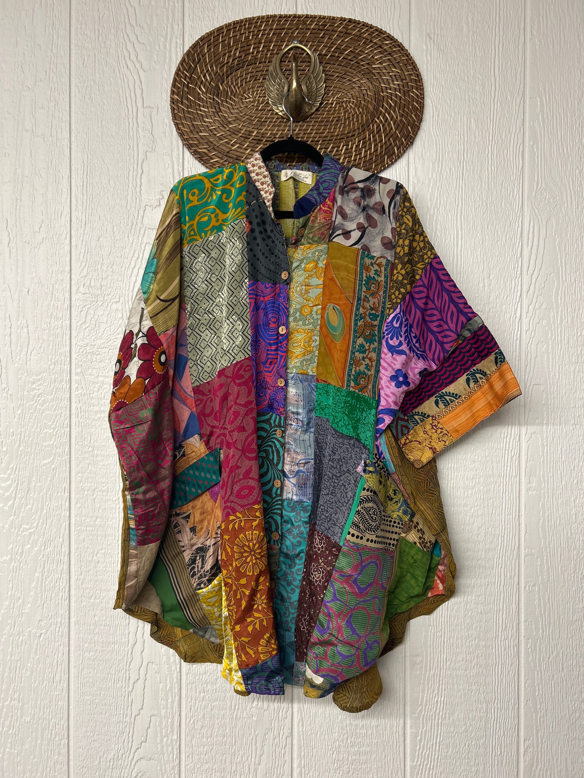 Made from hand-stitched patchwork vintage crepe sari, this billowy dream is fully lined in the front with cotton sari. Features a crepe panel in the back, functional buttons, two slouchy pockets in the front, and a curved bottom.