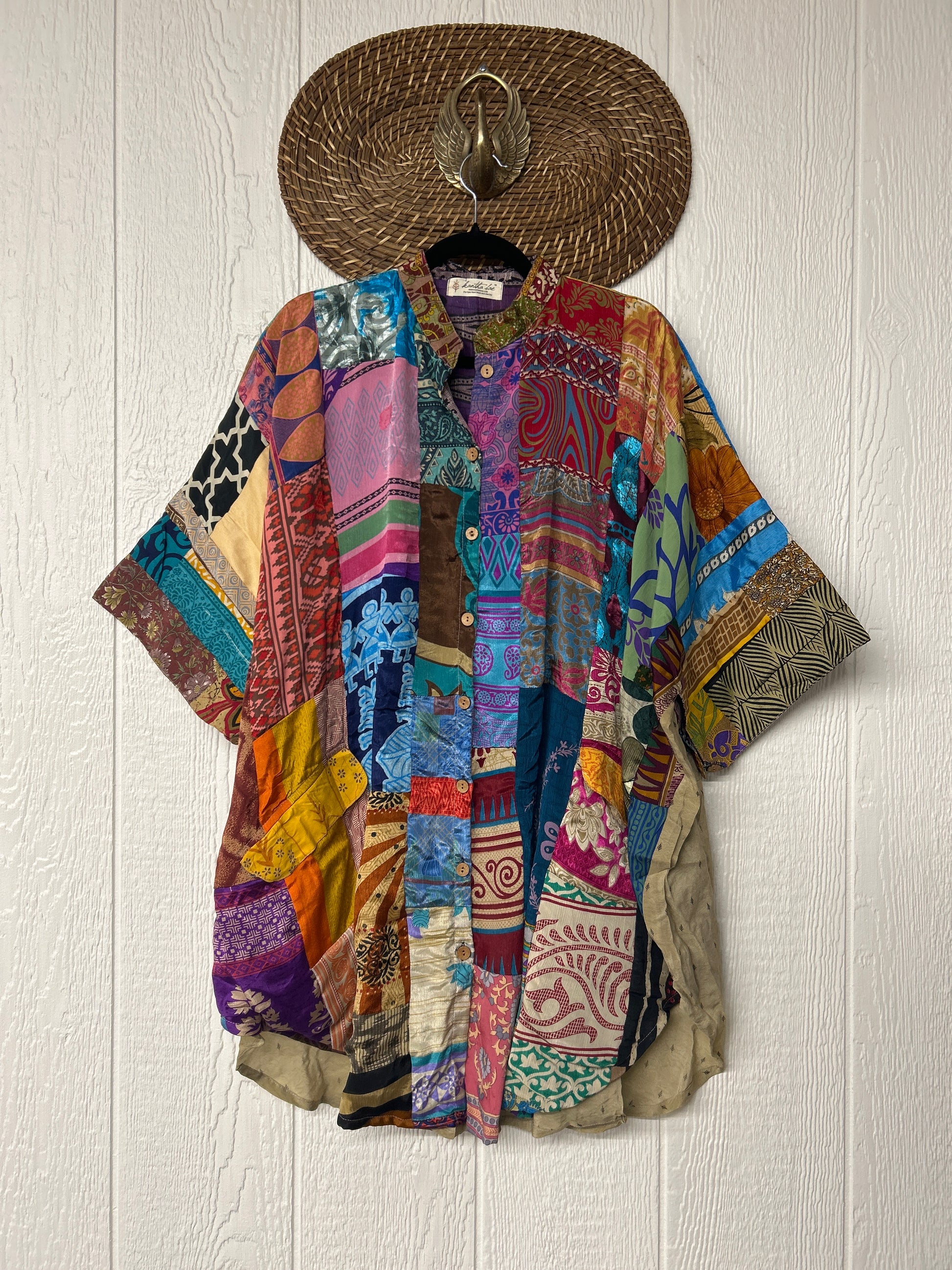Made from hand-stitched patchwork vintage crepe sari, this billowy dream is fully lined in the front with cotton sari. Features a crepe panel in the back, functional buttons, two slouchy pockets in the front, and a curved bottom.
