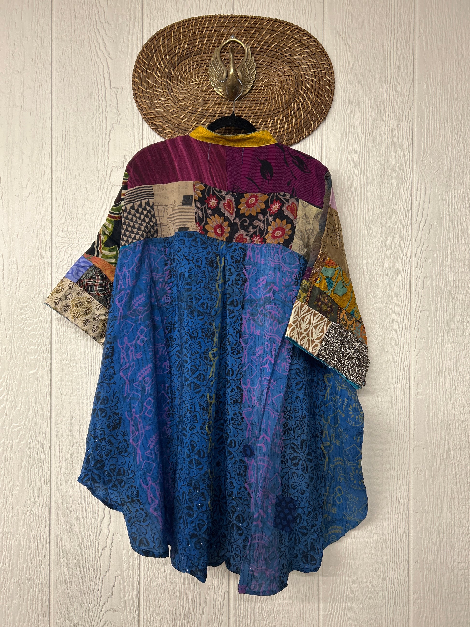 Made from hand-stitched patchwork vintage crepe sari, this billowy dream is fully lined in the front with cotton sari. Features a crepe panel in the back, functional buttons, two slouchy pockets in the front, and a curved bottom.