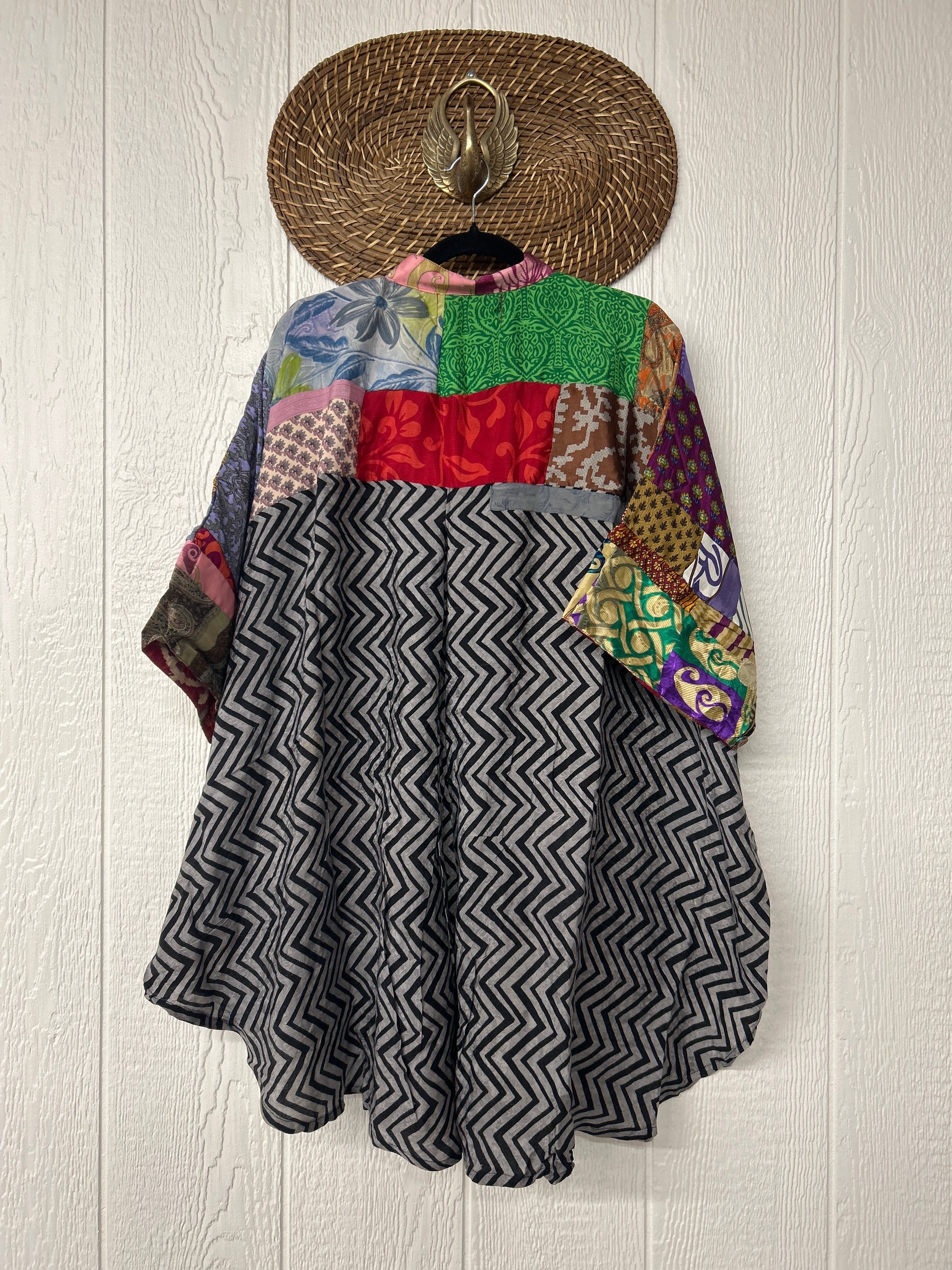 Made from hand-stitched patchwork vintage crepe sari, this billowy dream is fully lined in the front with cotton sari. Features a crepe panel in the back, functional buttons, two slouchy pockets in the front, and a curved bottom.