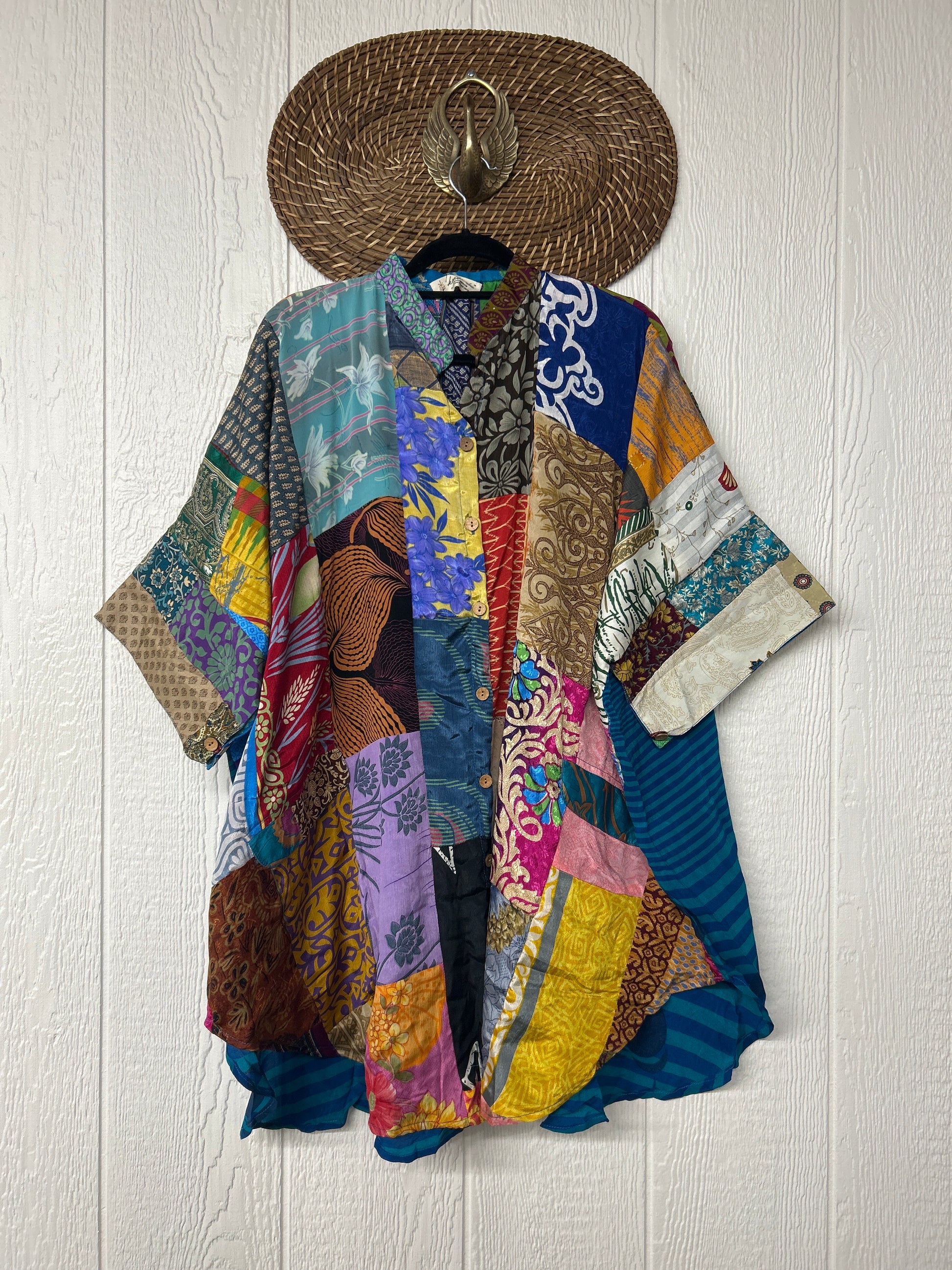 Made from hand-stitched patchwork vintage crepe sari, this billowy dream is fully lined in the front with cotton sari. Features a crepe panel in the back, functional buttons, two slouchy pockets in the front, and a curved bottom.