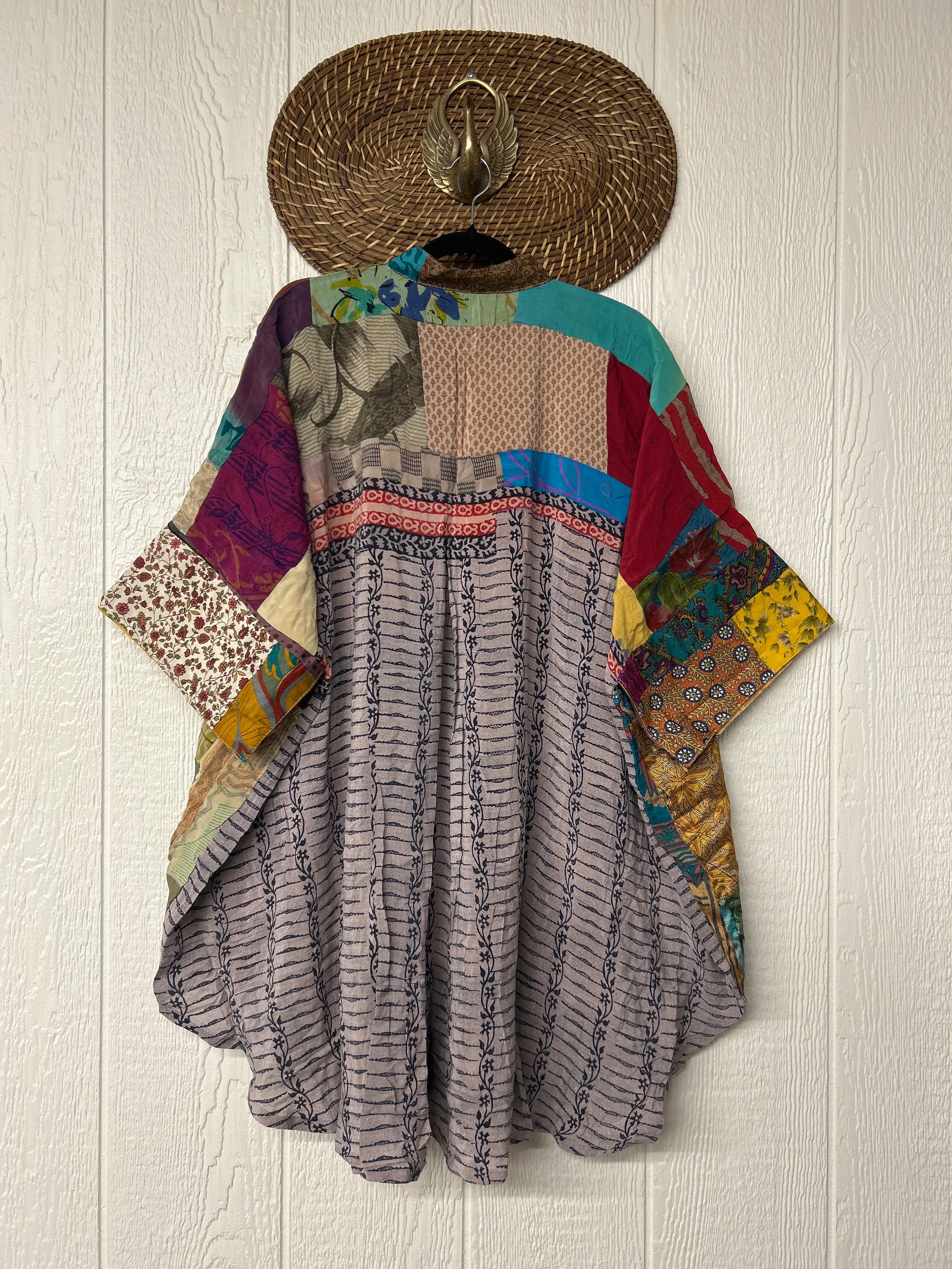 Made from hand-stitched patchwork vintage crepe sari, this billowy dream is fully lined in the front with cotton sari. Features a crepe panel in the back, functional buttons, two slouchy pockets in the front, and a curved bottom.
