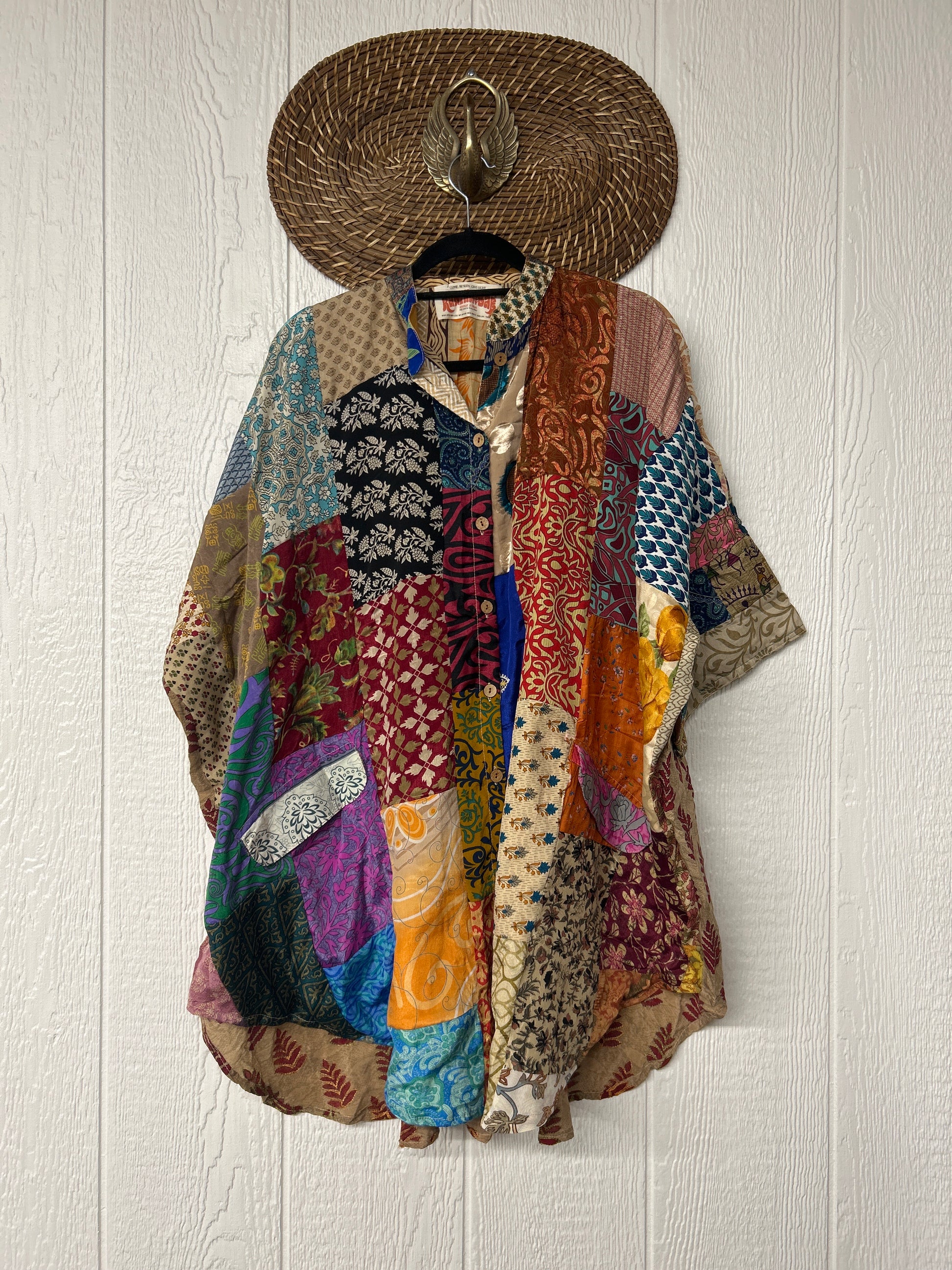 Made from hand-stitched patchwork vintage crepe sari, this billowy dream is fully lined in the front with cotton sari. Features a crepe panel in the back, functional buttons, two slouchy pockets in the front, and a curved bottom.
