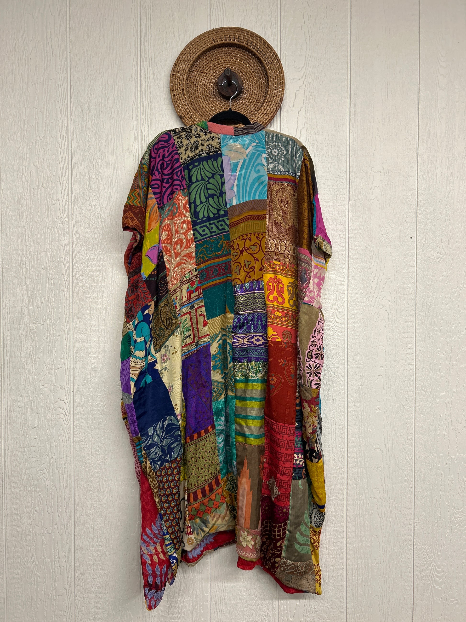 Patchwork outer garment is made from upcycled vintage rasgulla and crepe and fully lined in printed cotton sari. Features slouchy outer pockets, a v neckline and side slits for extra dimension.