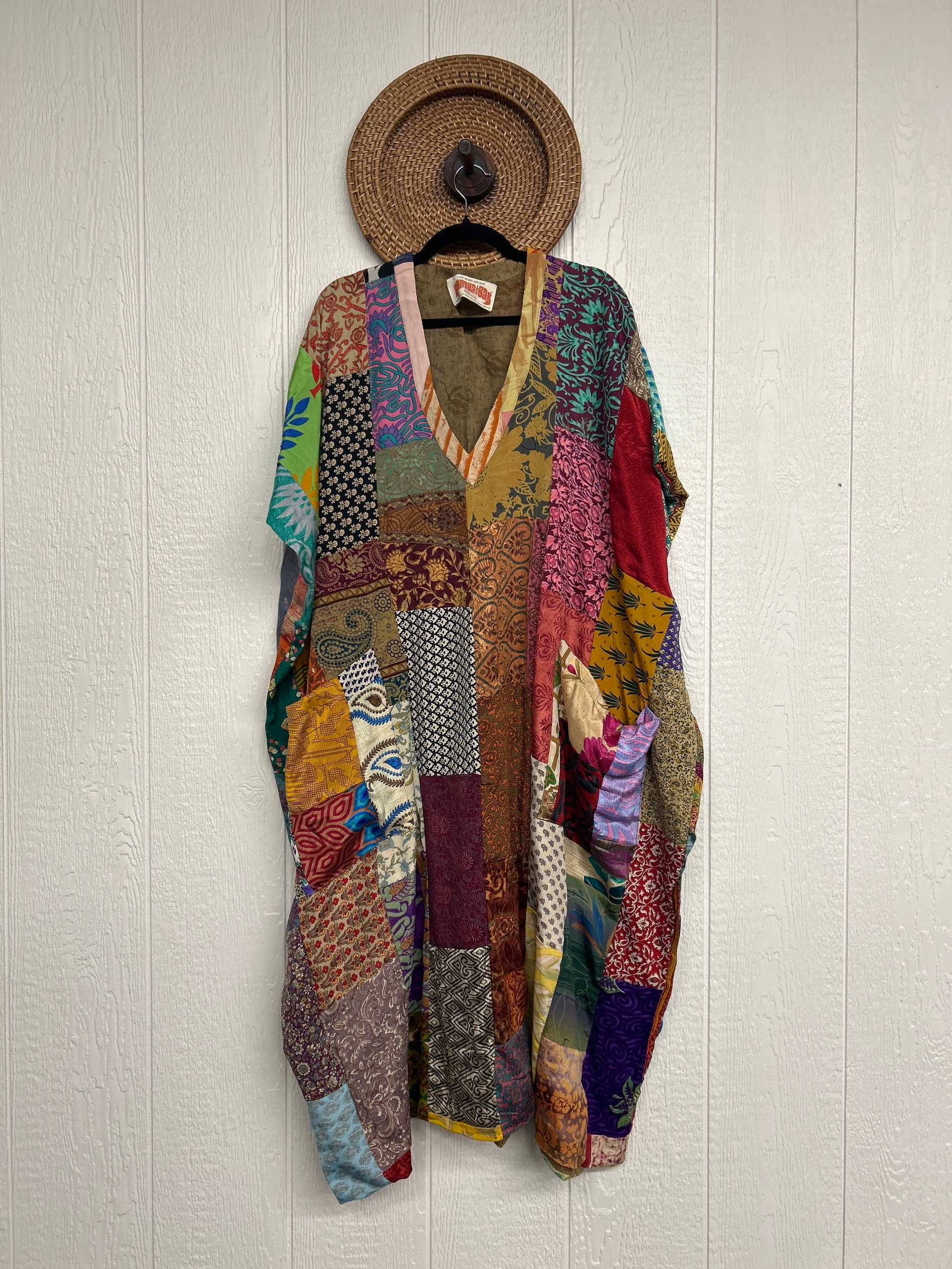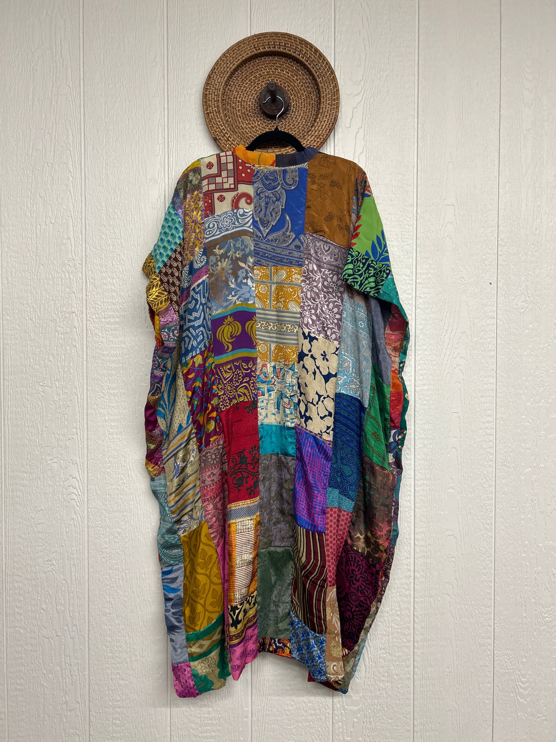 Patchwork outer garment is made from upcycled vintage rasgulla and crepe and fully lined in printed cotton sari. Features slouchy outer pockets, a v neckline and side slits for extra dimension.