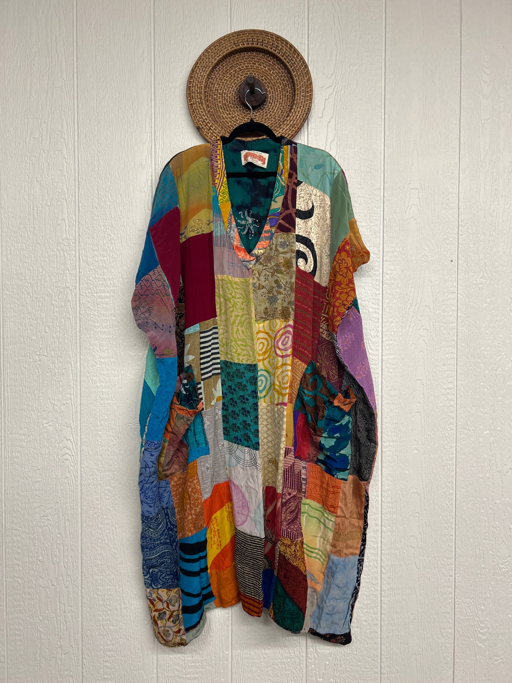 Patchwork outer garment is made from upcycled vintage rasgulla and crepe and fully lined in printed cotton sari. Features slouchy outer pockets, a v neckline and side slits for extra dimension.