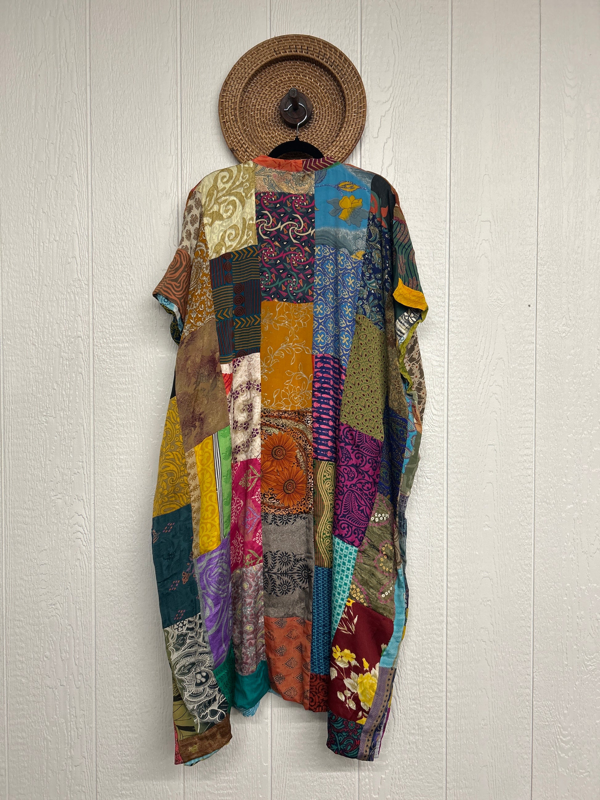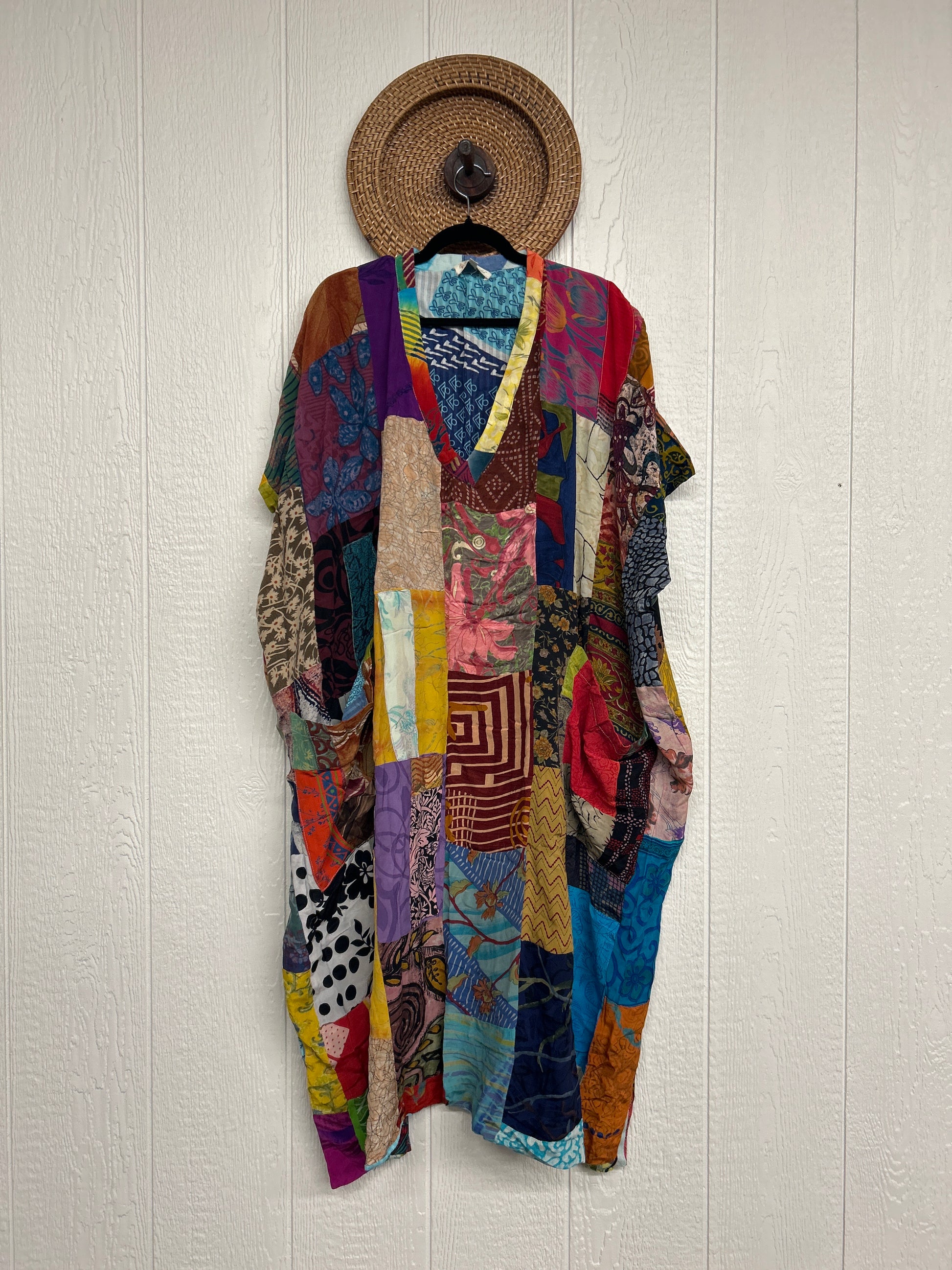 Patchwork outer garment is made from upcycled vintage rasgulla and crepe and fully lined in printed cotton sari. Features slouchy outer pockets, a v neckline and side slits for extra dimension.