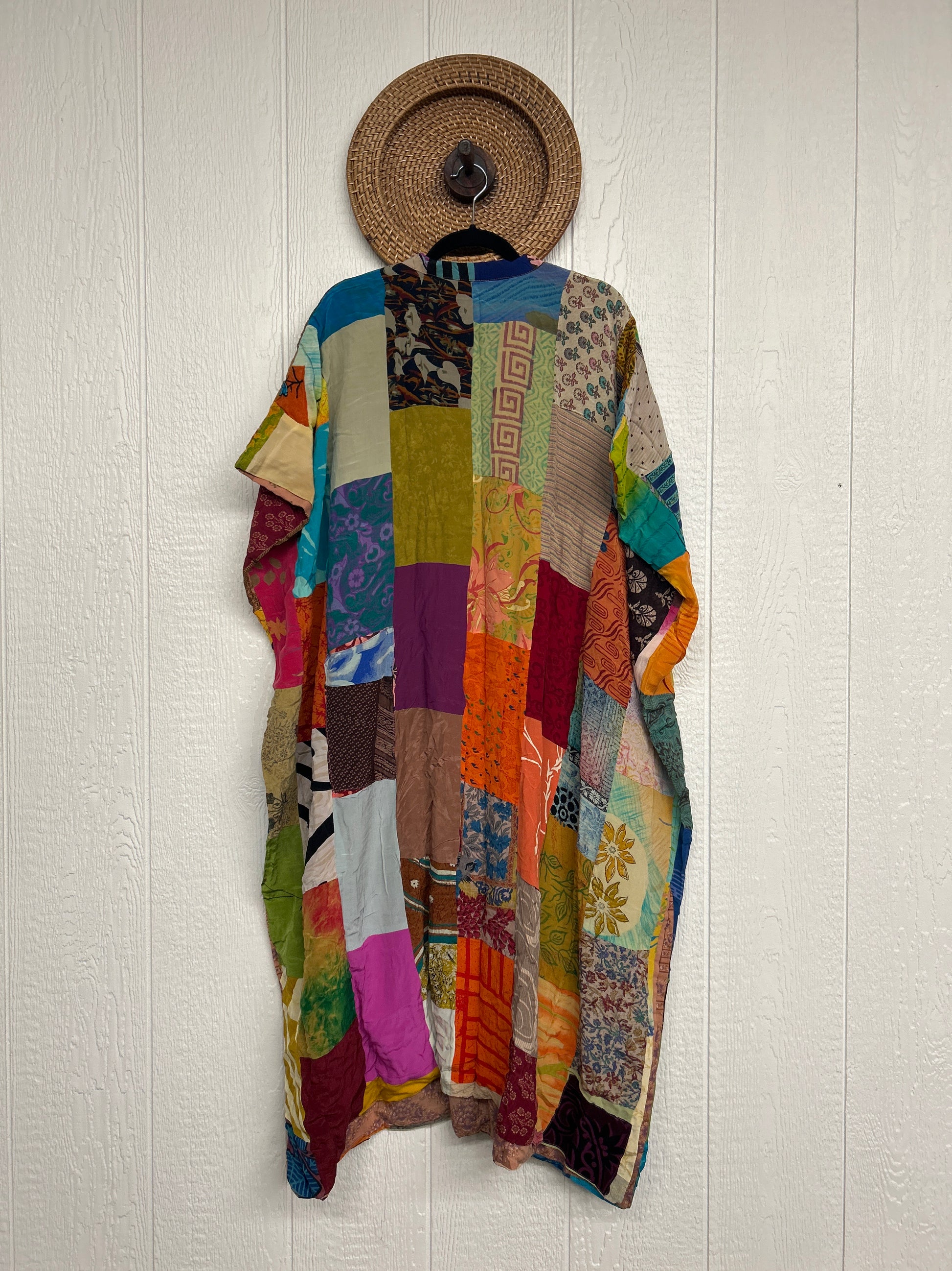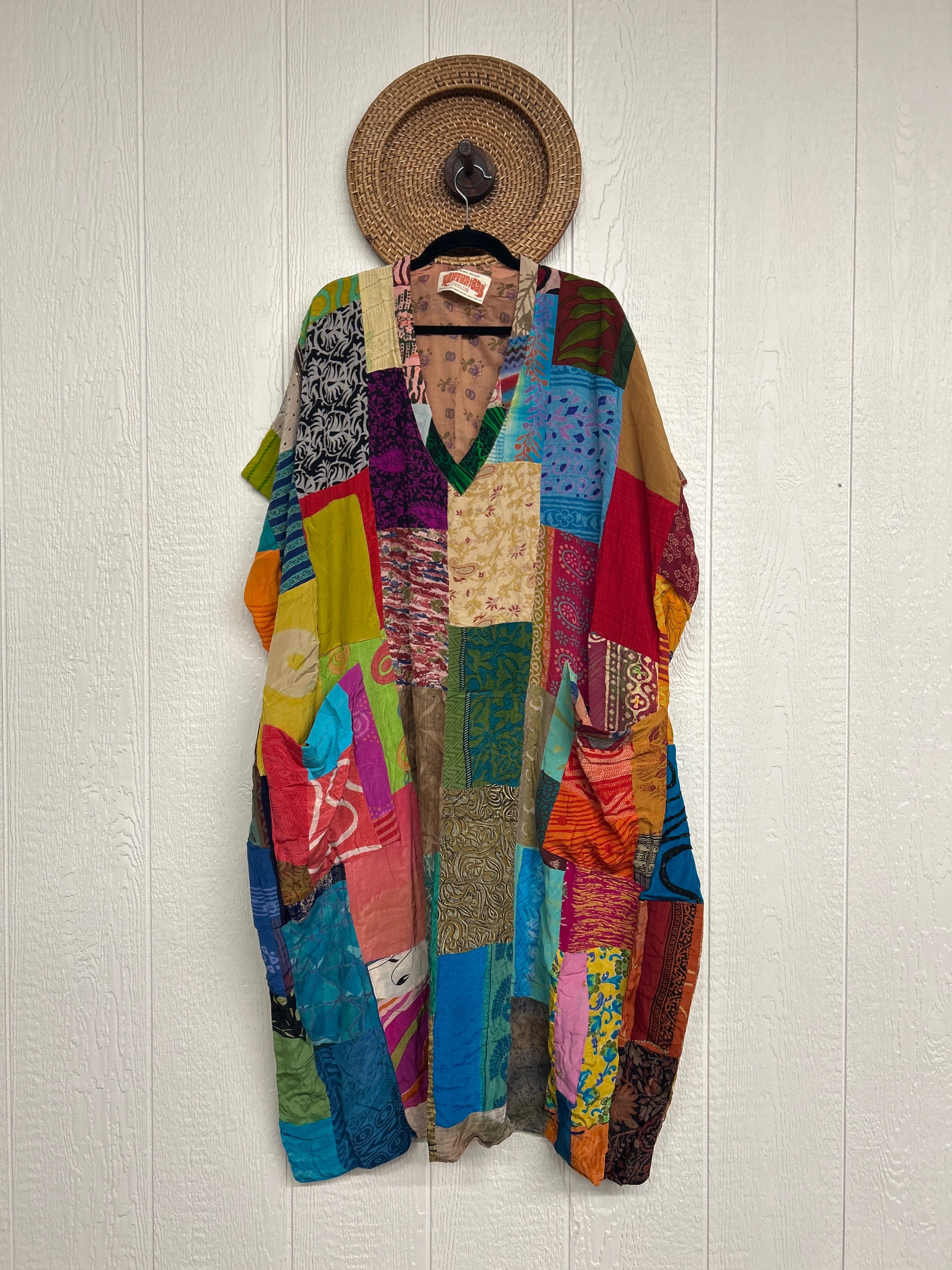 Patchwork outer garment is made from upcycled vintage rasgulla and crepe and fully lined in printed cotton sari. Features slouchy outer pockets, a v neckline and side slits for extra dimension.