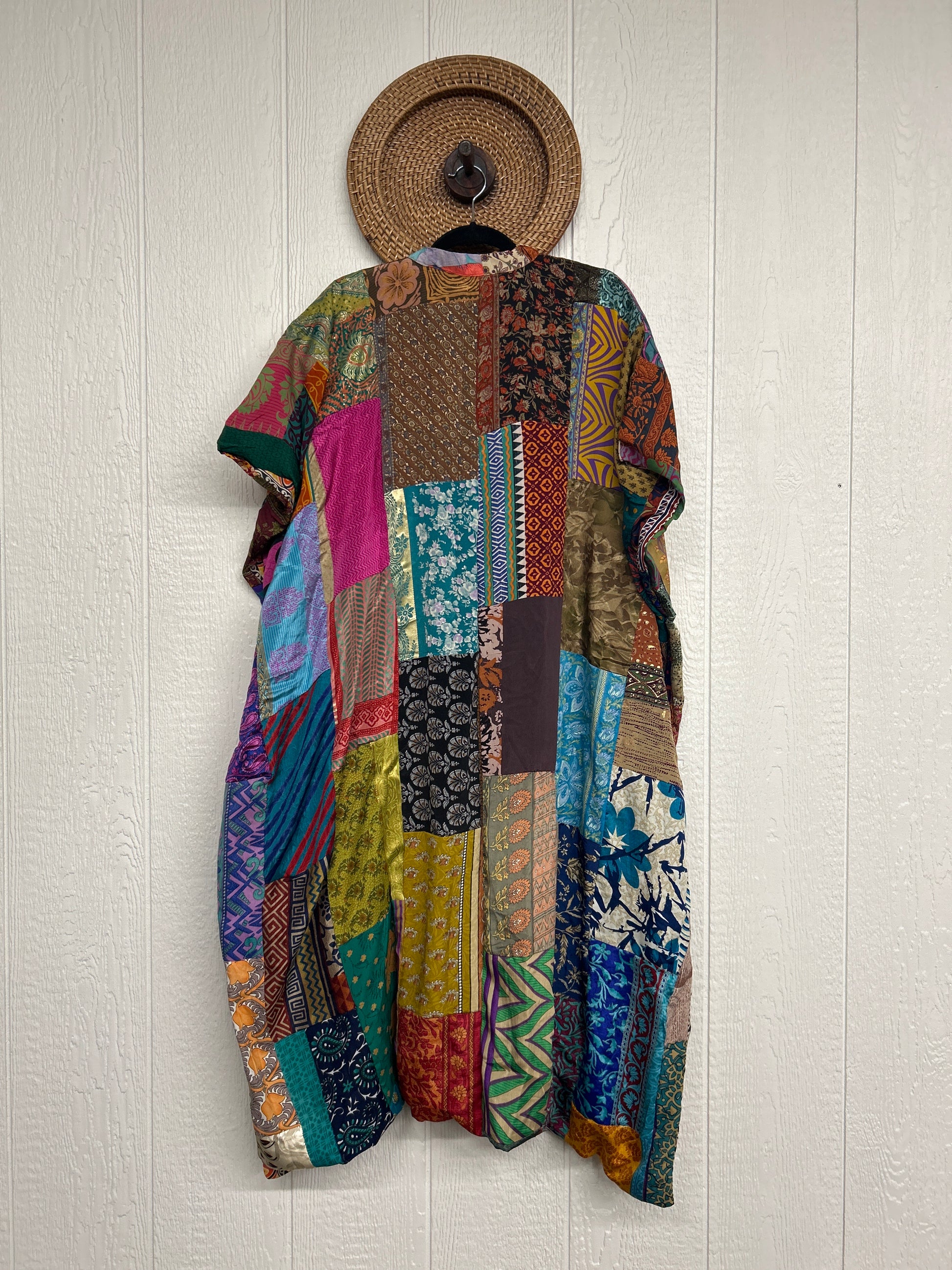 Patchwork outer garment is made from upcycled vintage rasgulla and crepe and fully lined in printed cotton sari. Features slouchy outer pockets, a v neckline and side slits for extra dimension.