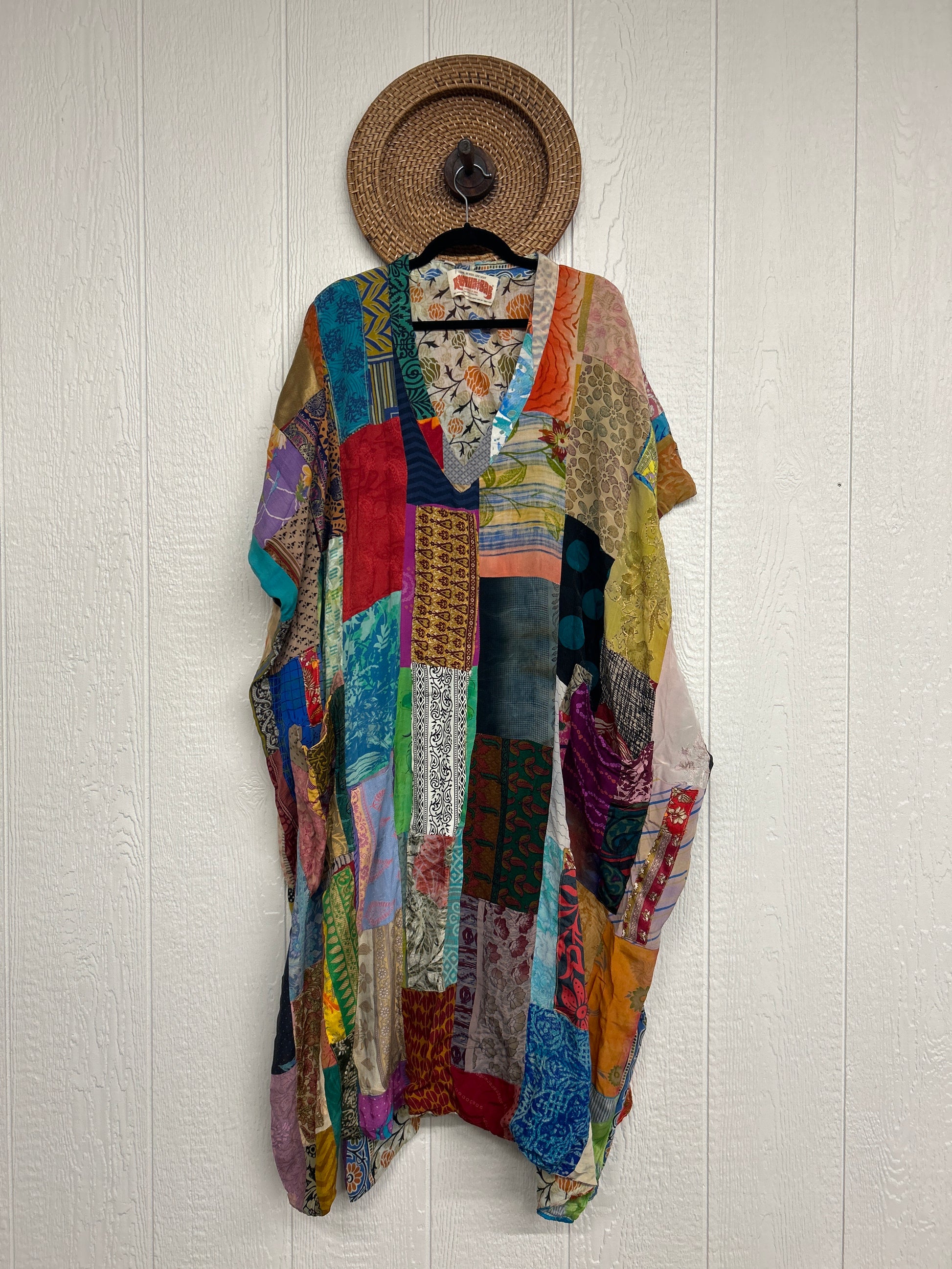 Patchwork outer garment is made from upcycled vintage rasgulla and crepe and fully lined in printed cotton sari. Features slouchy outer pockets, a v neckline and side slits for extra dimension.