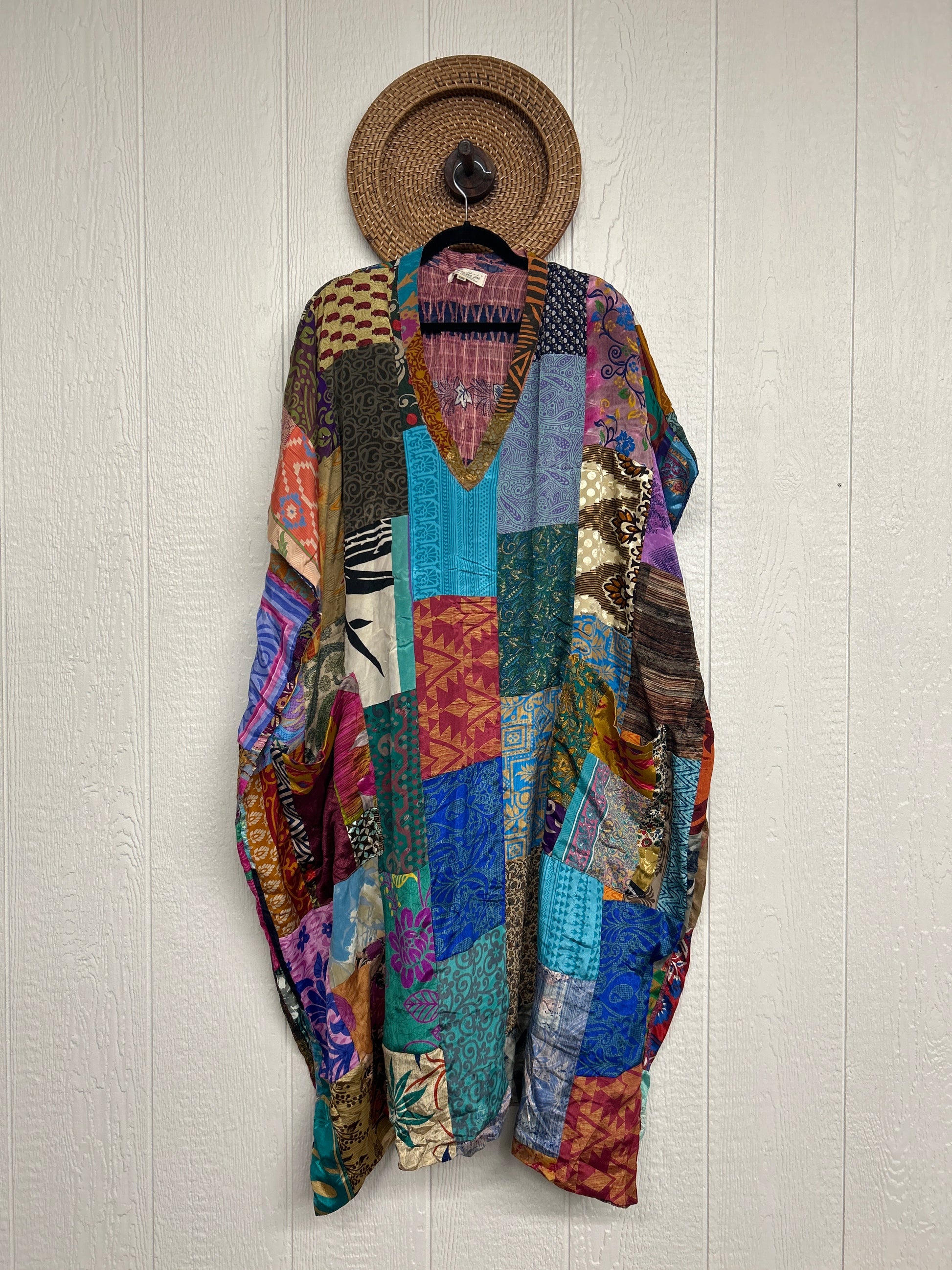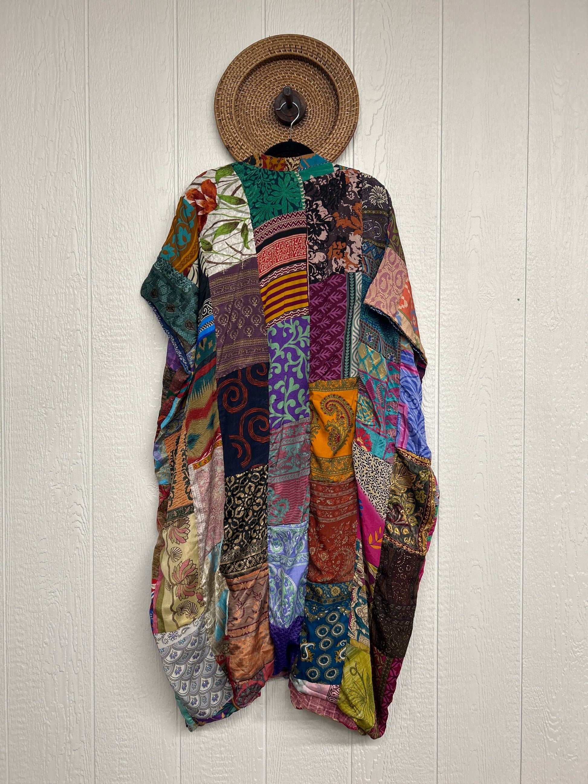 Patchwork outer garment is made from upcycled vintage rasgulla and crepe and fully lined in printed cotton sari. Features slouchy outer pockets, a v neckline and side slits for extra dimension.