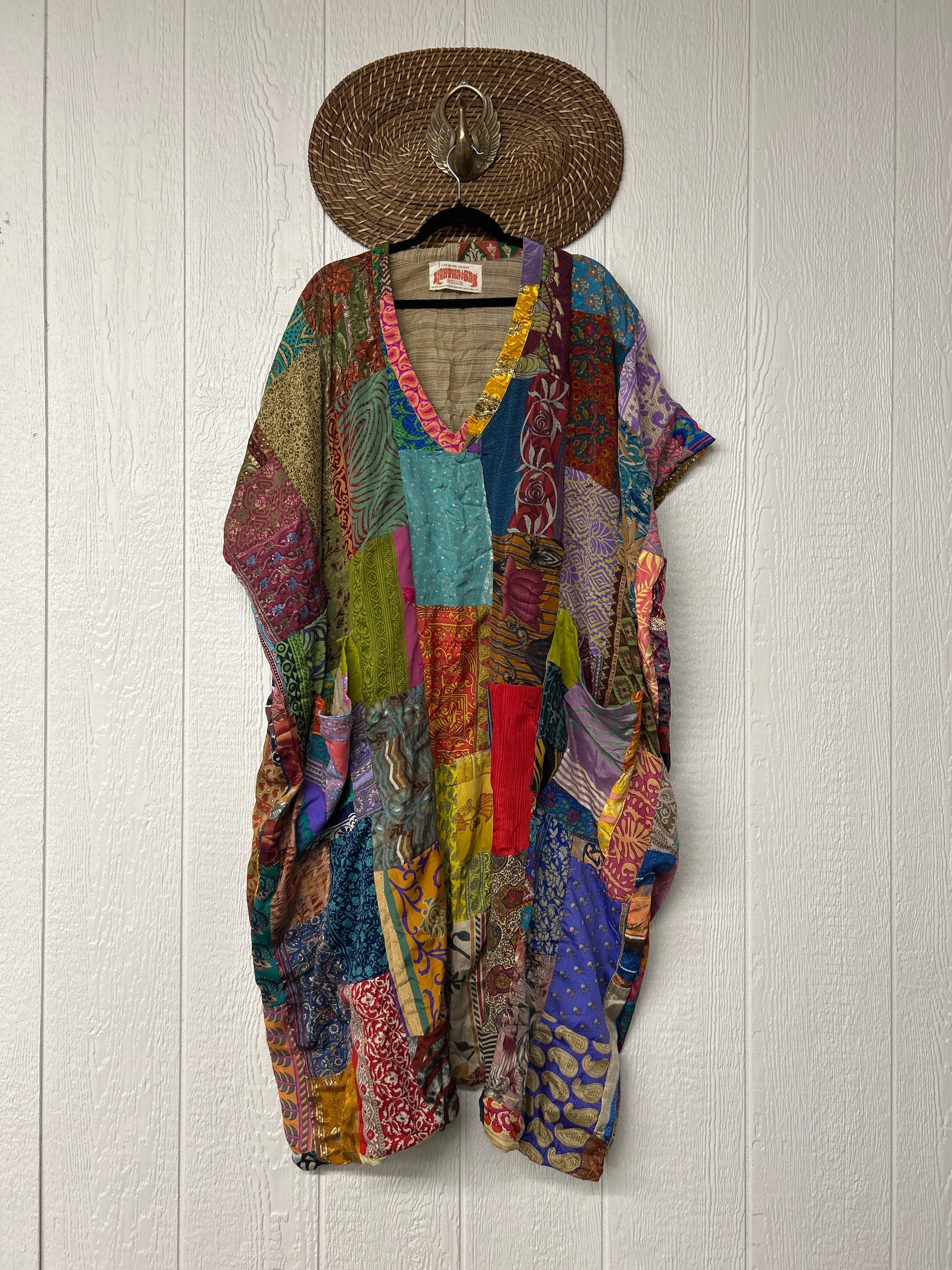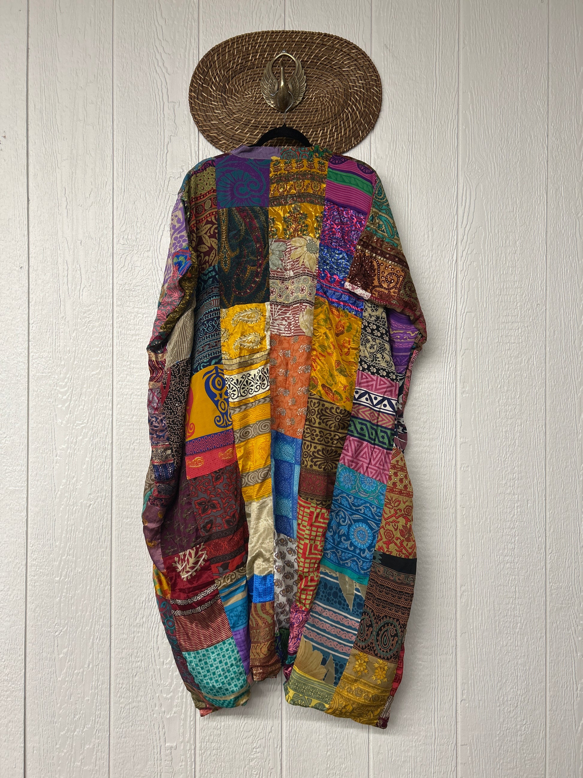 Patchwork outer garment is made from upcycled vintage rasgulla and crepe and fully lined in printed cotton sari. Features slouchy outer pockets, a v neckline and side slits for extra dimension.