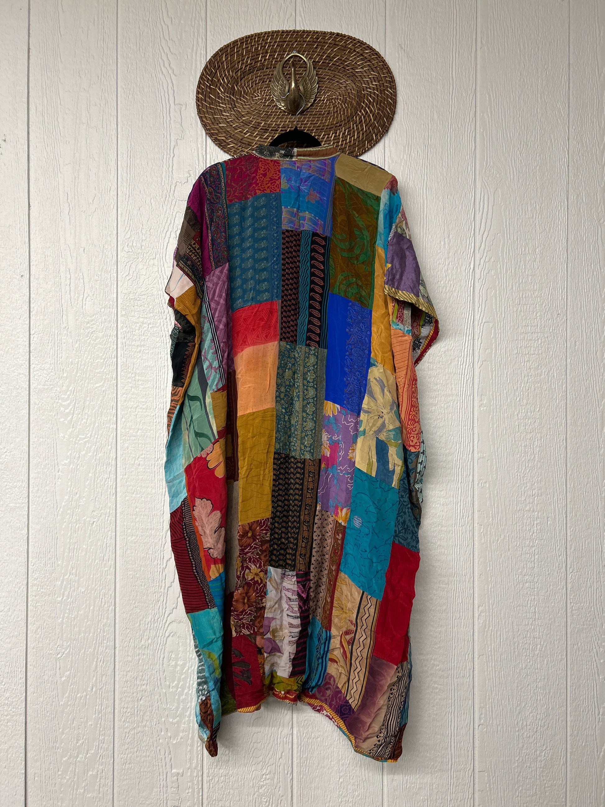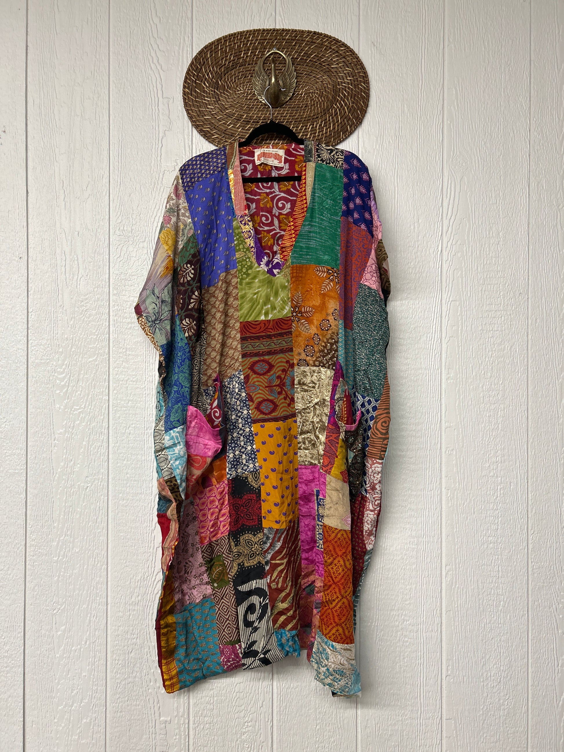 Patchwork outer garment is made from upcycled vintage rasgulla and crepe and fully lined in printed cotton sari. Features slouchy outer pockets, a v neckline and side slits for extra dimension.