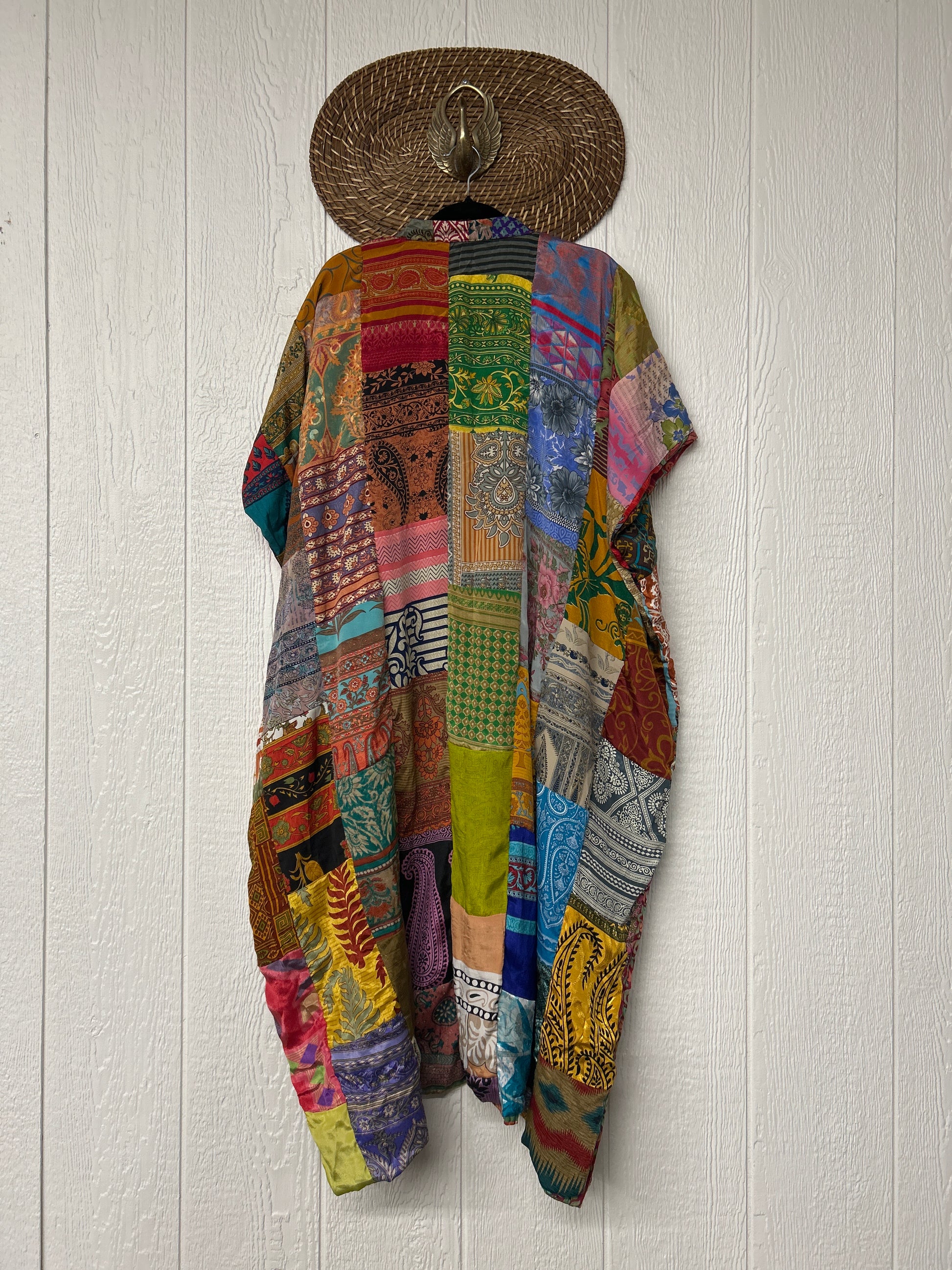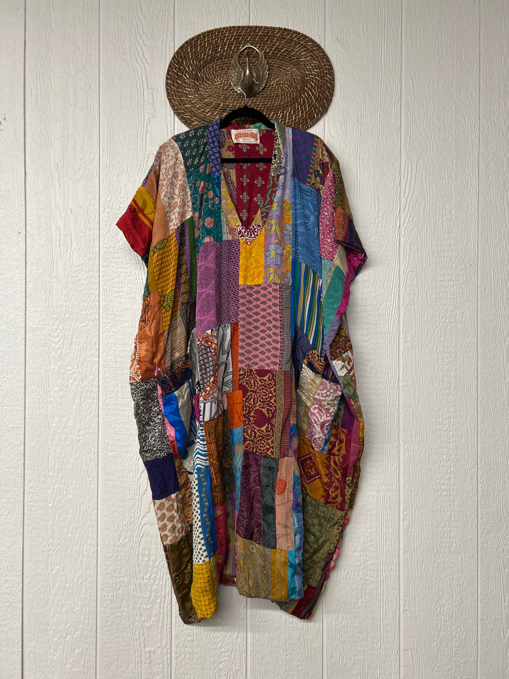 Patchwork outer garment is made from upcycled vintage rasgulla and crepe and fully lined in printed cotton sari. Features slouchy outer pockets, a v neckline and side slits for extra dimension.