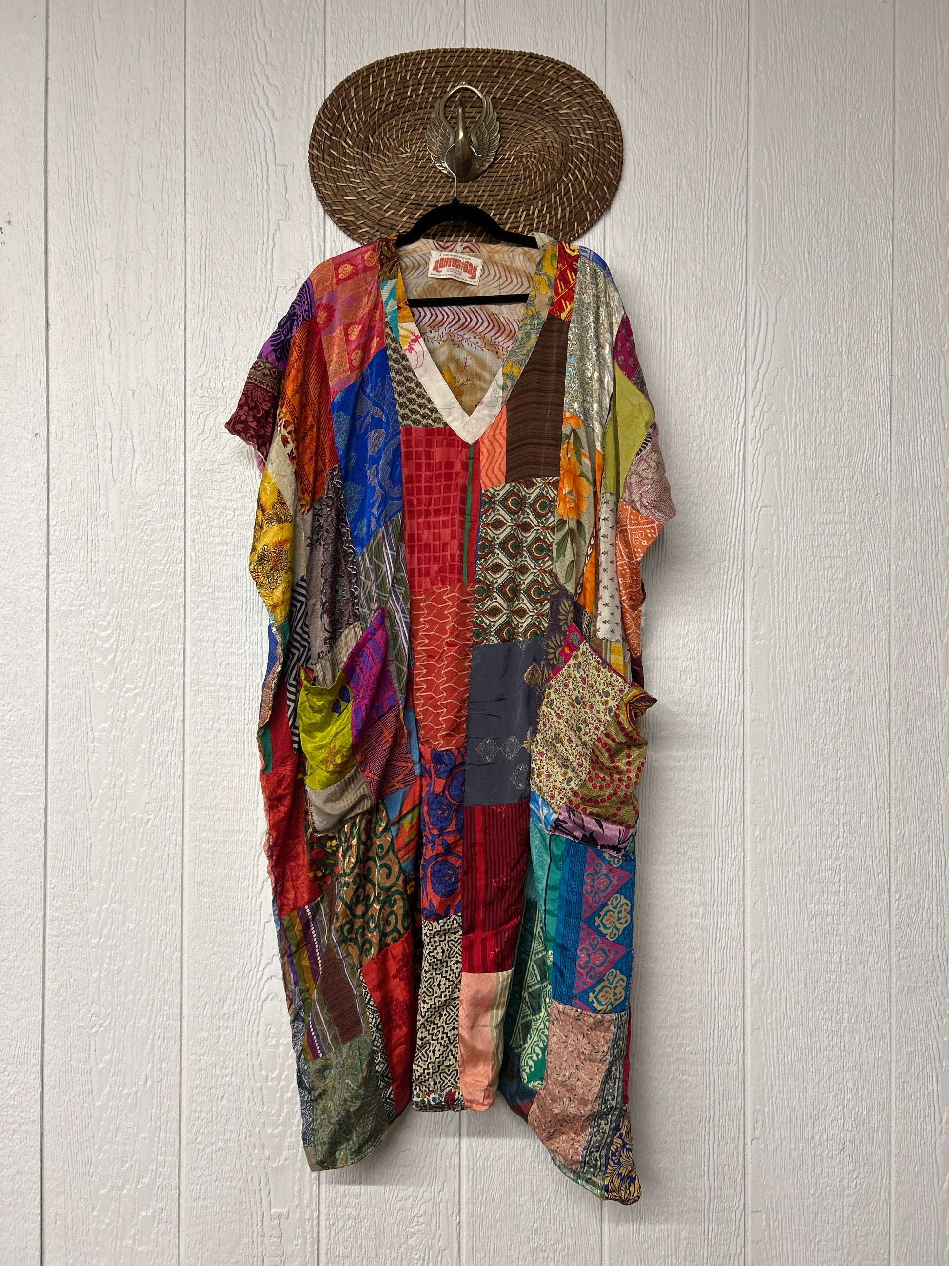 Patchwork outer garment is made from upcycled vintage rasgulla and crepe and fully lined in printed cotton sari. Features slouchy outer pockets, a v neckline and side slits for extra dimension.