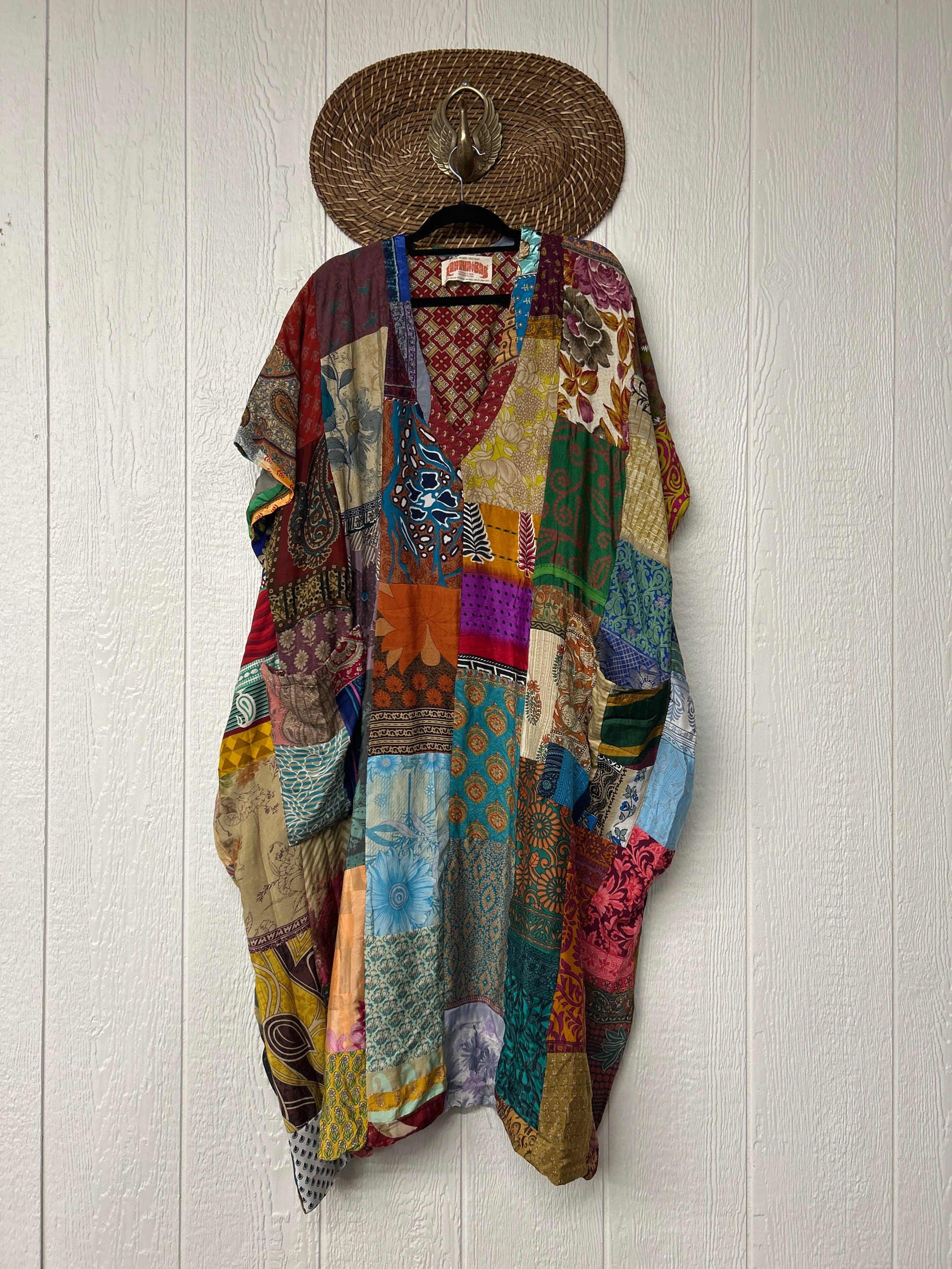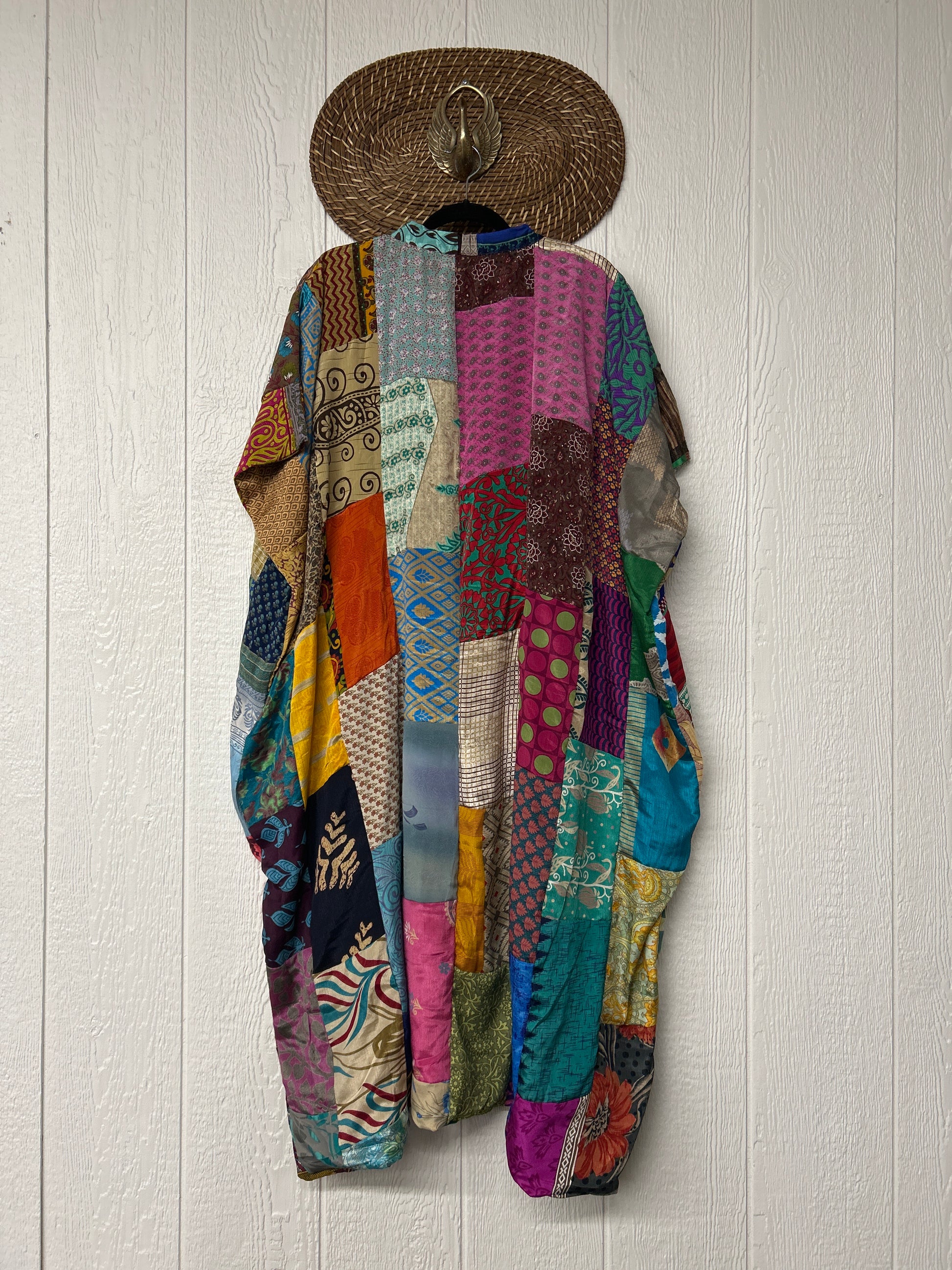 Patchwork outer garment is made from upcycled vintage rasgulla and crepe and fully lined in printed cotton sari. Features slouchy outer pockets, a v neckline and side slits for extra dimension.