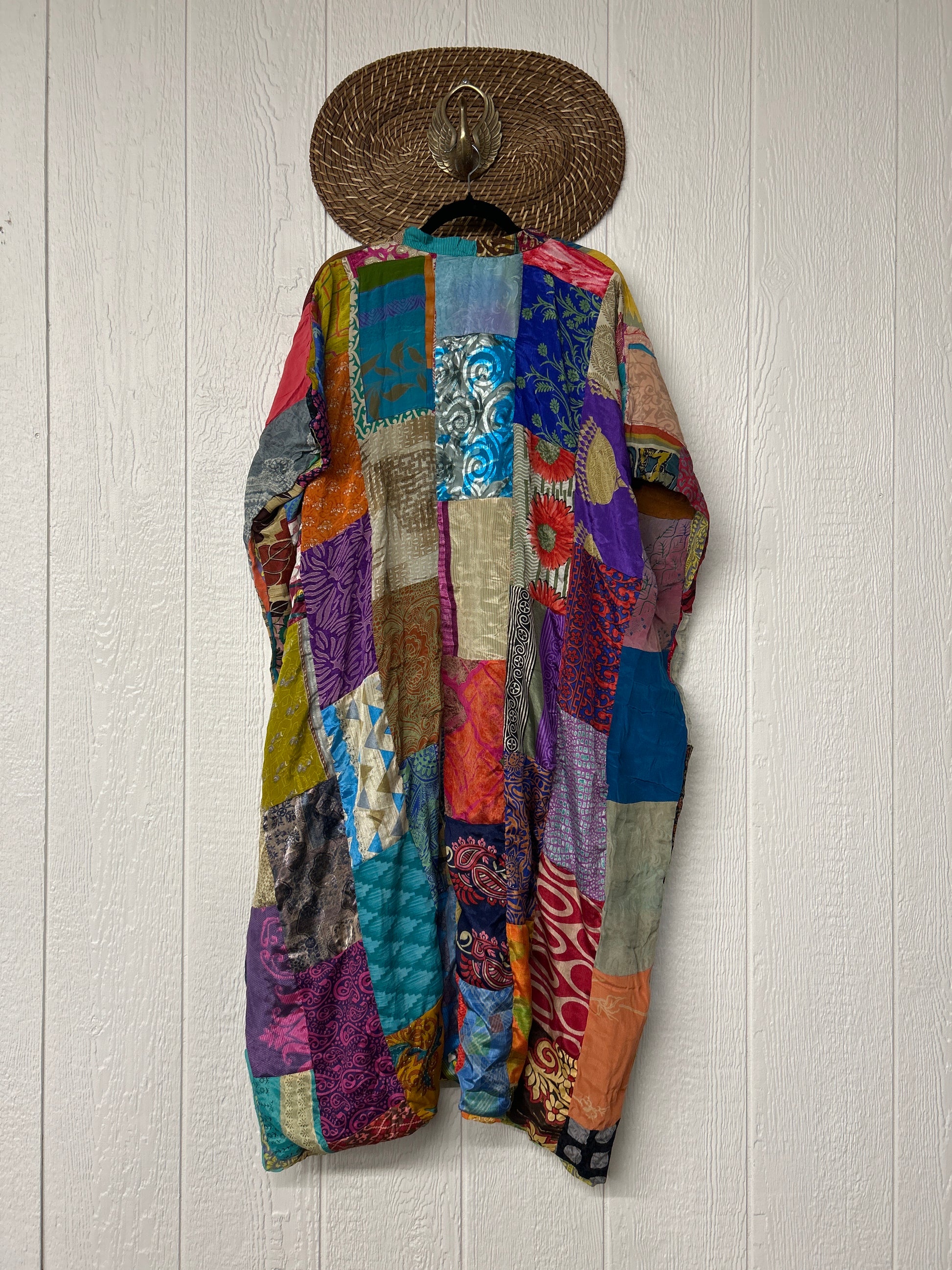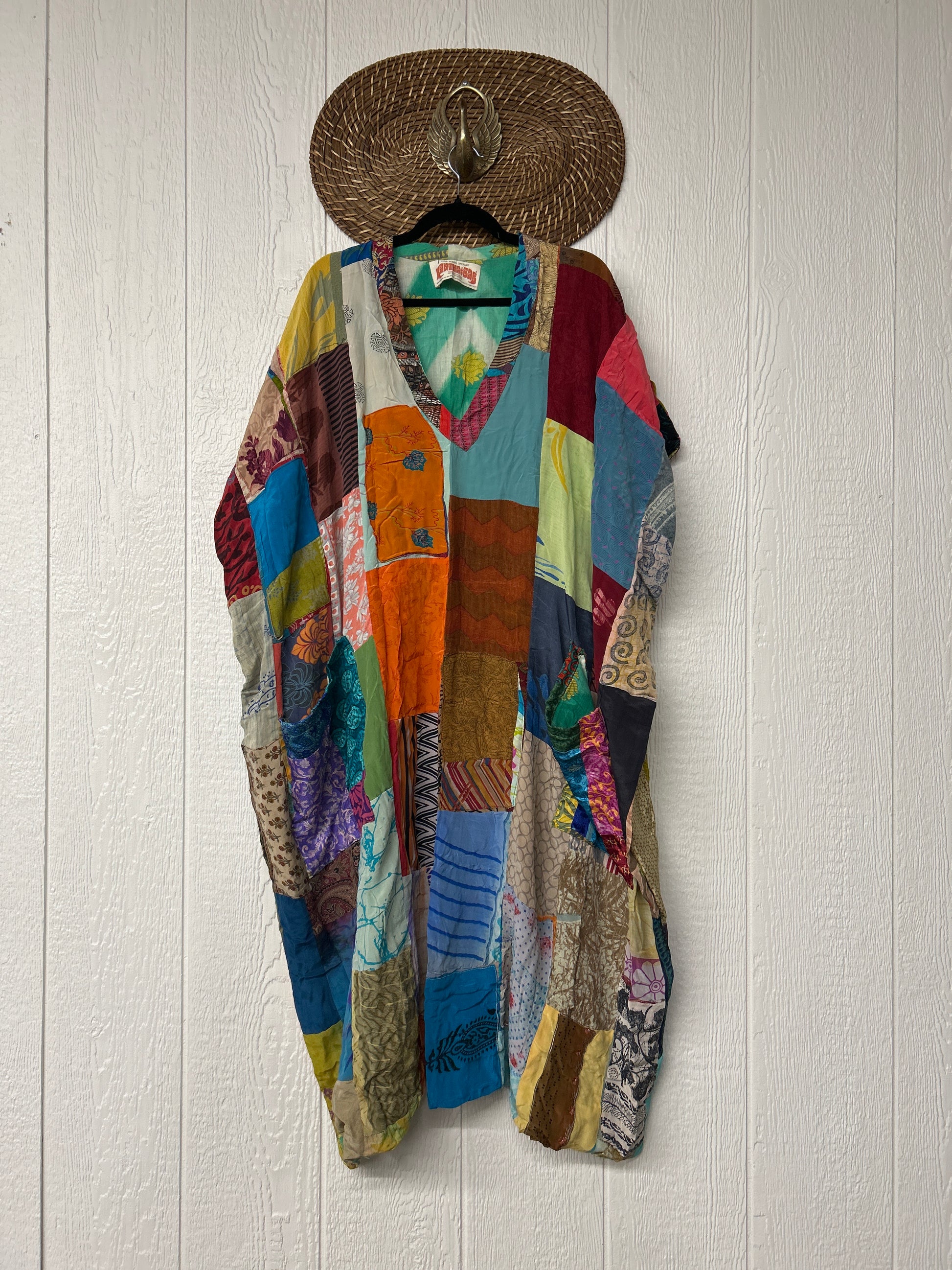 Patchwork outer garment is made from upcycled vintage rasgulla and crepe and fully lined in printed cotton sari. Features slouchy outer pockets, a v neckline and side slits for extra dimension.