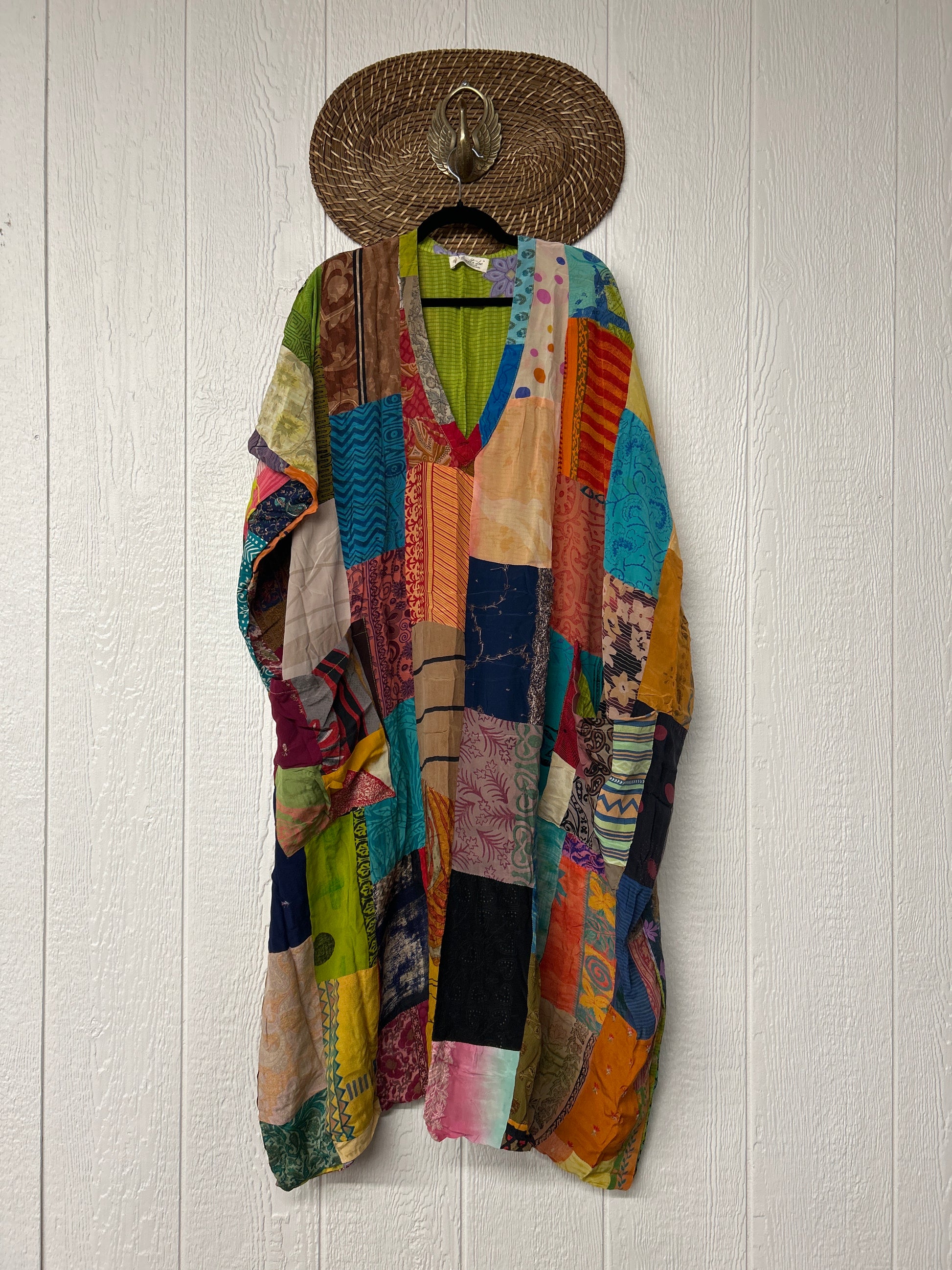 Patchwork outer garment is made from upcycled vintage rasgulla and crepe and fully lined in printed cotton sari. Features slouchy outer pockets, a v neckline and side slits for extra dimension.