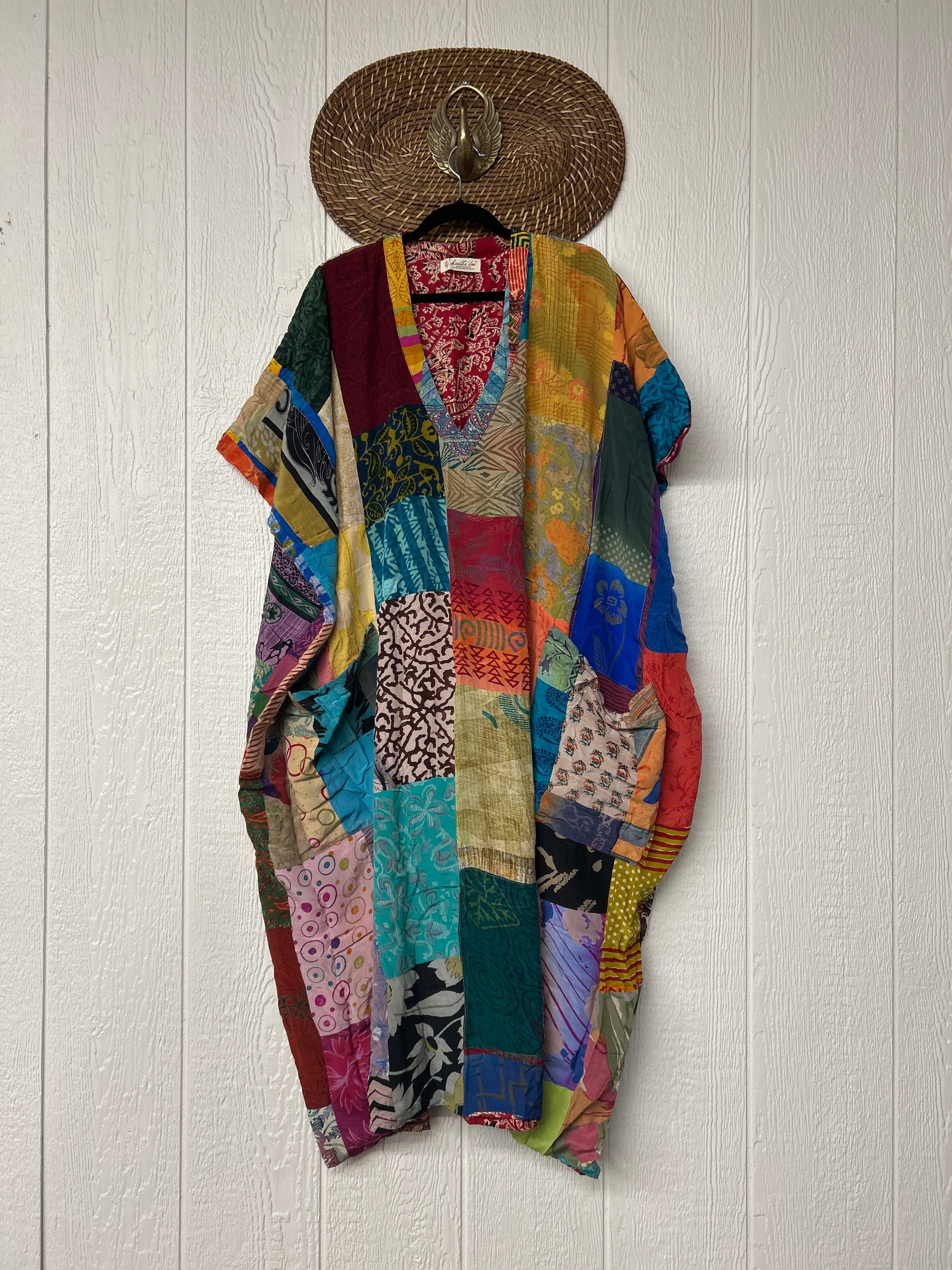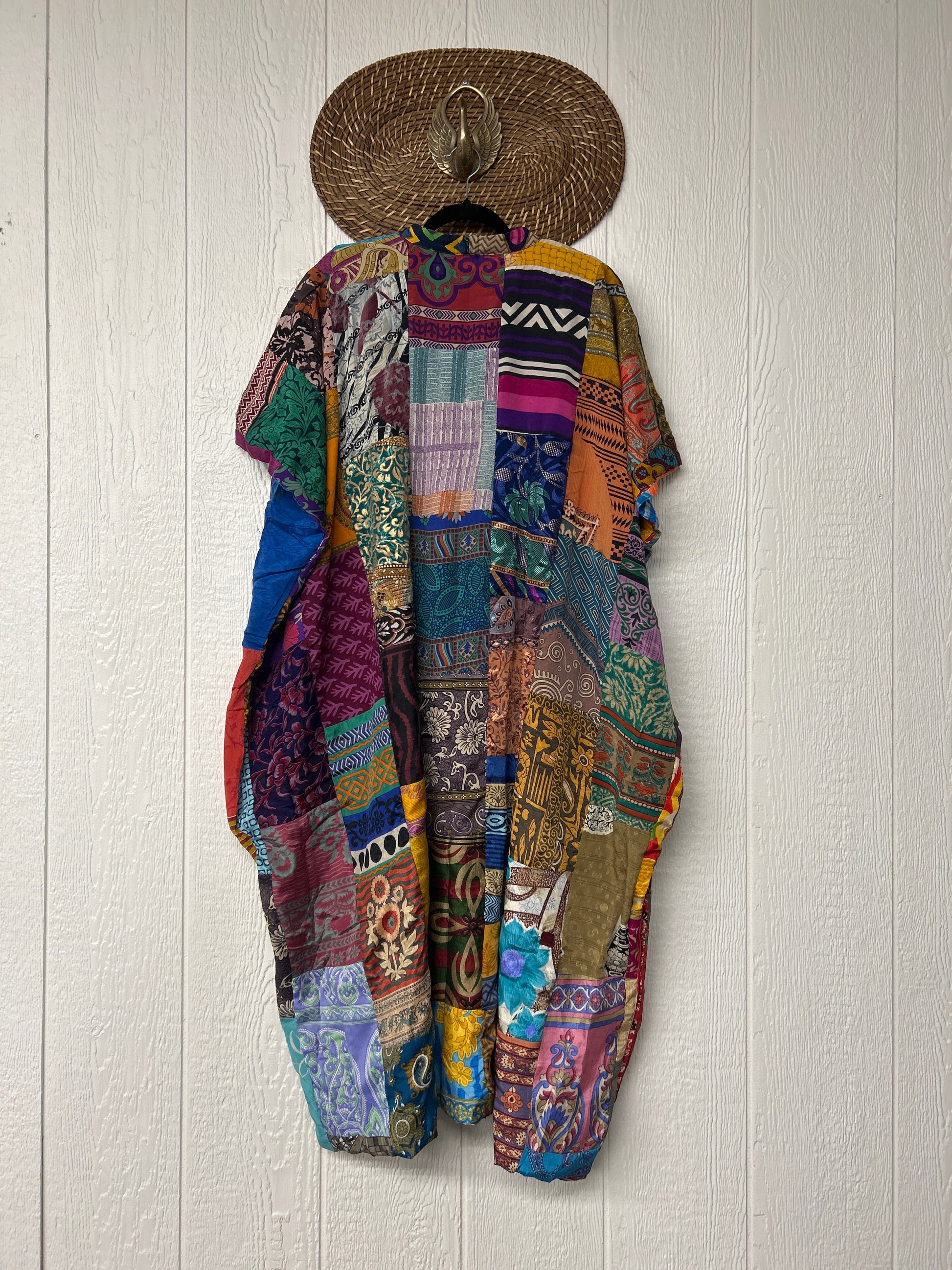 Patchwork outer garment is made from upcycled vintage rasgulla and crepe and fully lined in printed cotton sari. Features slouchy outer pockets, a v neckline and side slits for extra dimension.