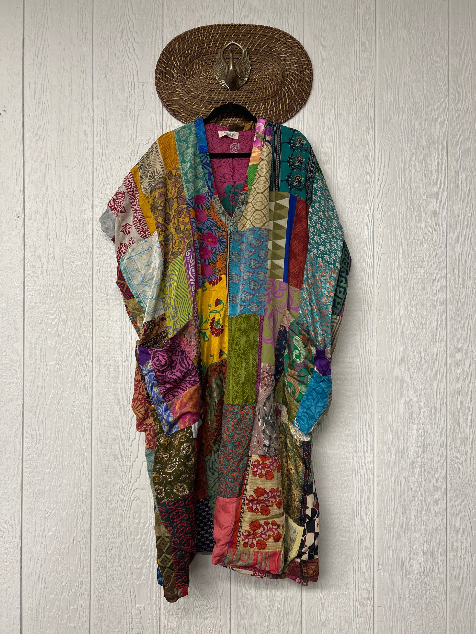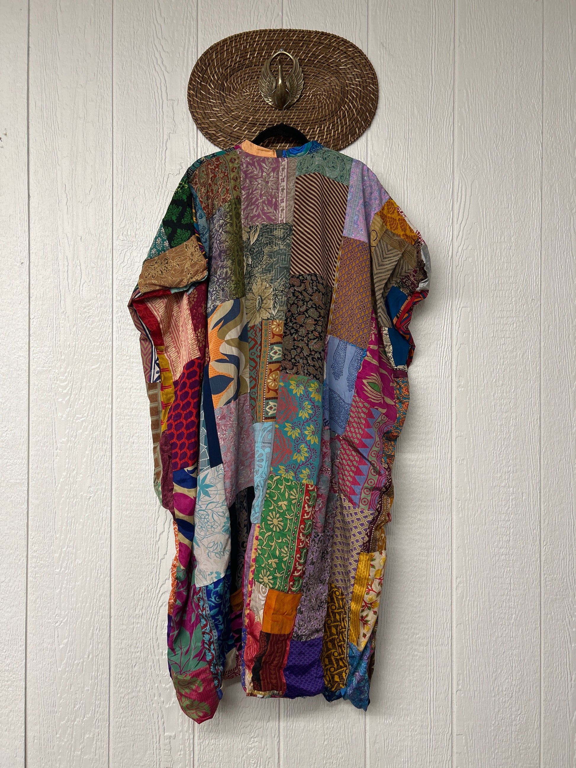 Patchwork outer garment is made from upcycled vintage rasgulla and crepe and fully lined in printed cotton sari. Features slouchy outer pockets, a v neckline and side slits for extra dimension.