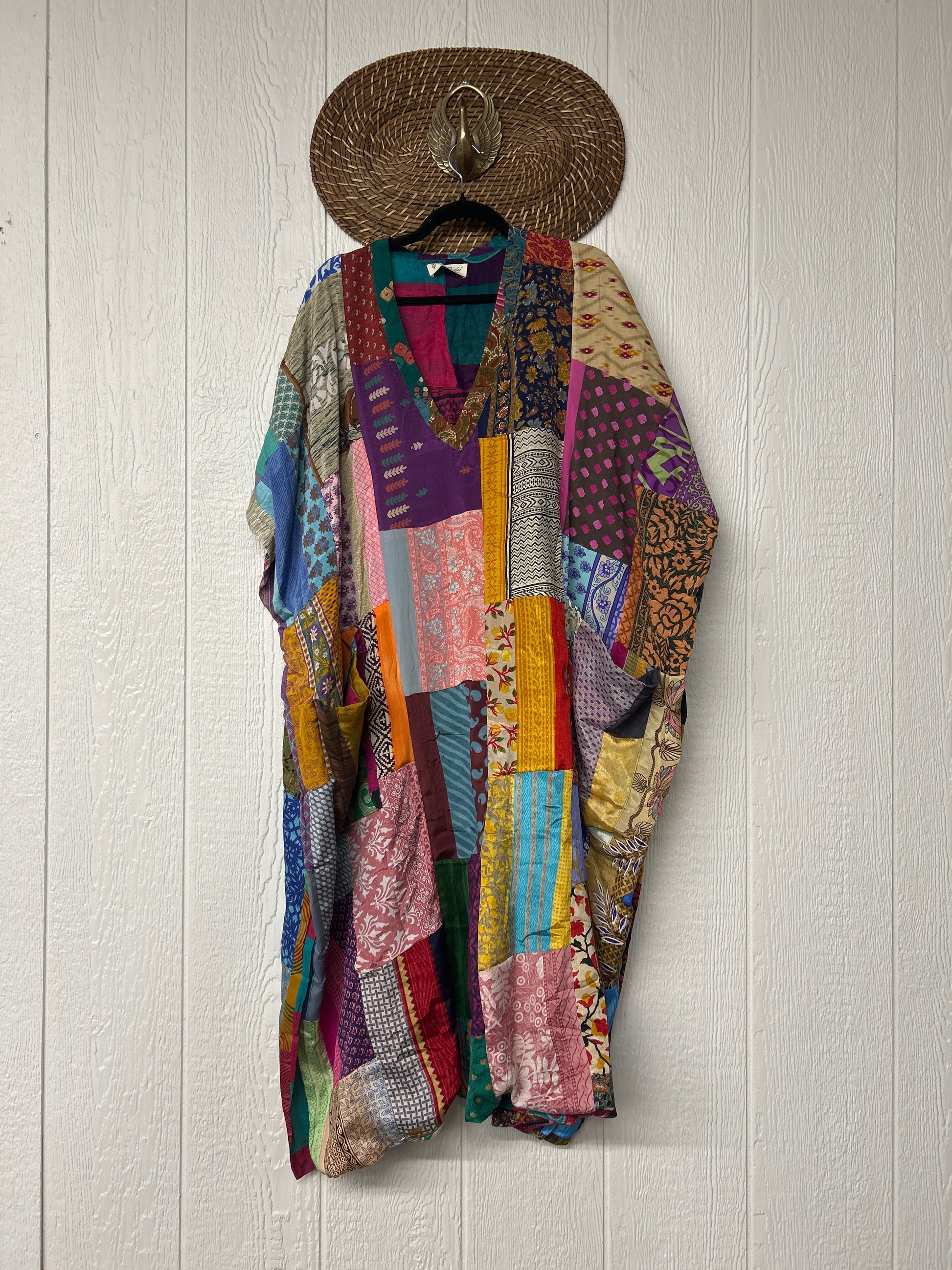 Patchwork outer garment is made from upcycled vintage rasgulla and crepe and fully lined in printed cotton sari. Features slouchy outer pockets, a v neckline and side slits for extra dimension.