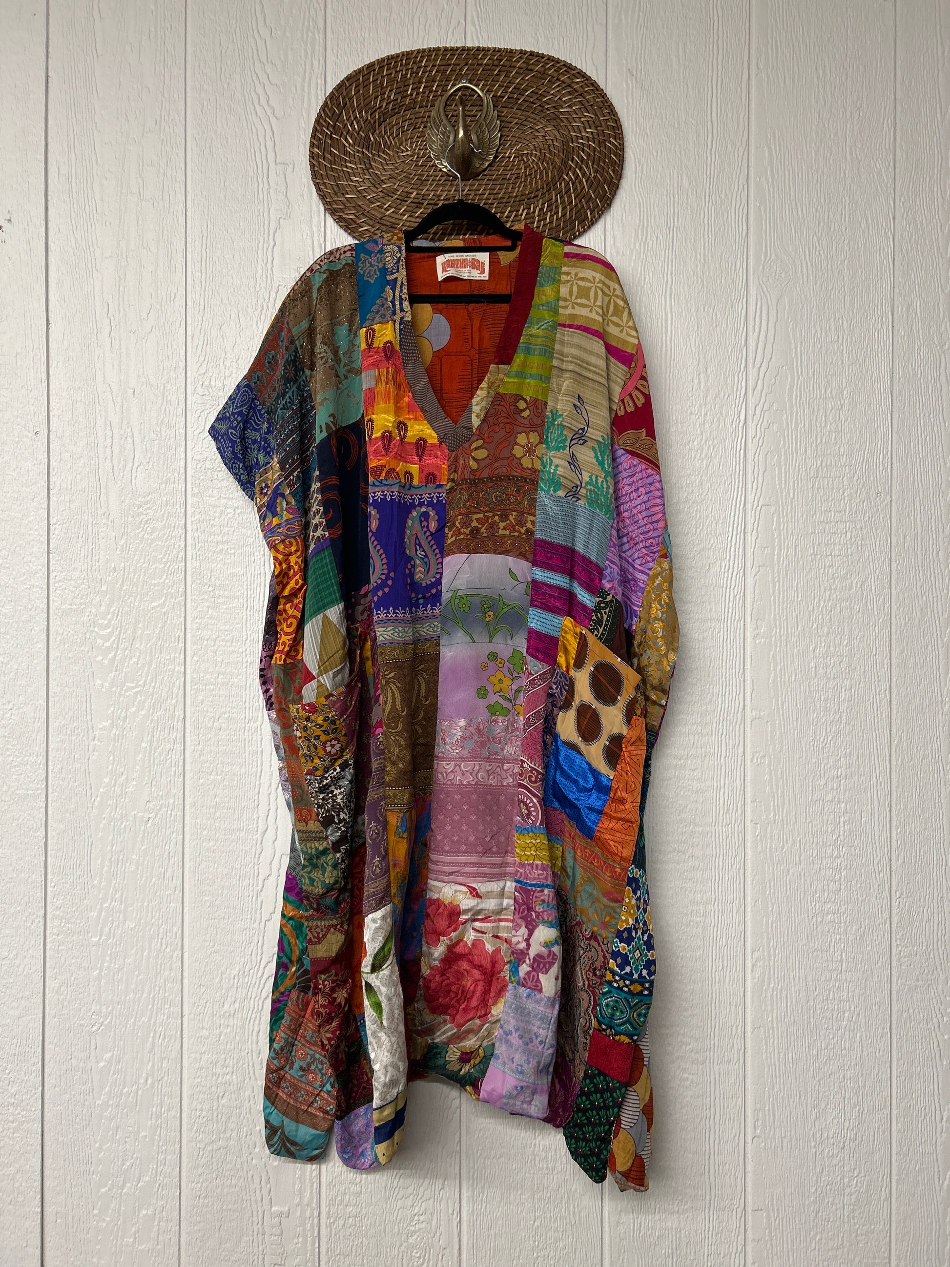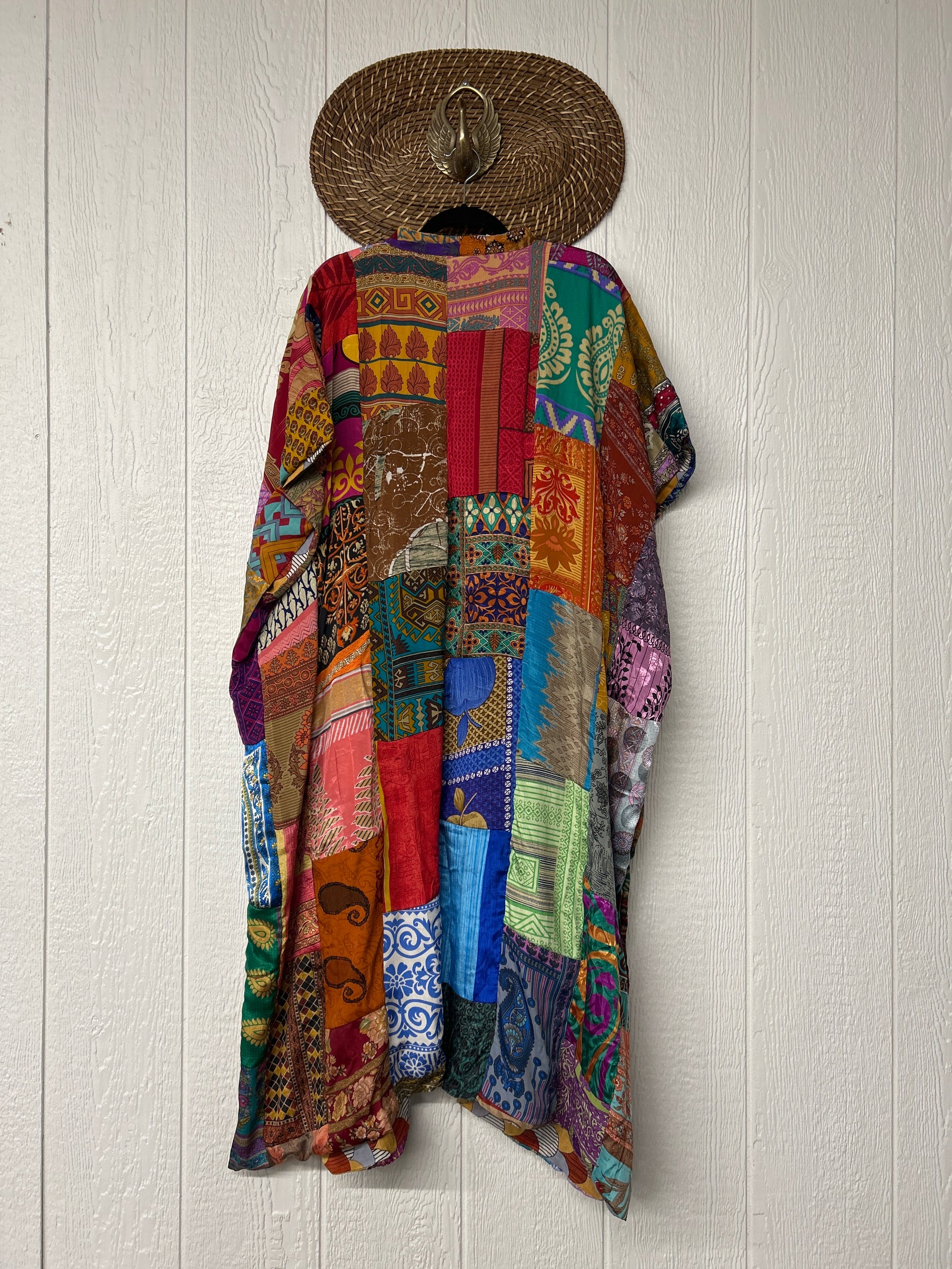 Patchwork outer garment is made from upcycled vintage rasgulla and crepe and fully lined in printed cotton sari. Features slouchy outer pockets, a v neckline and side slits for extra dimension.
