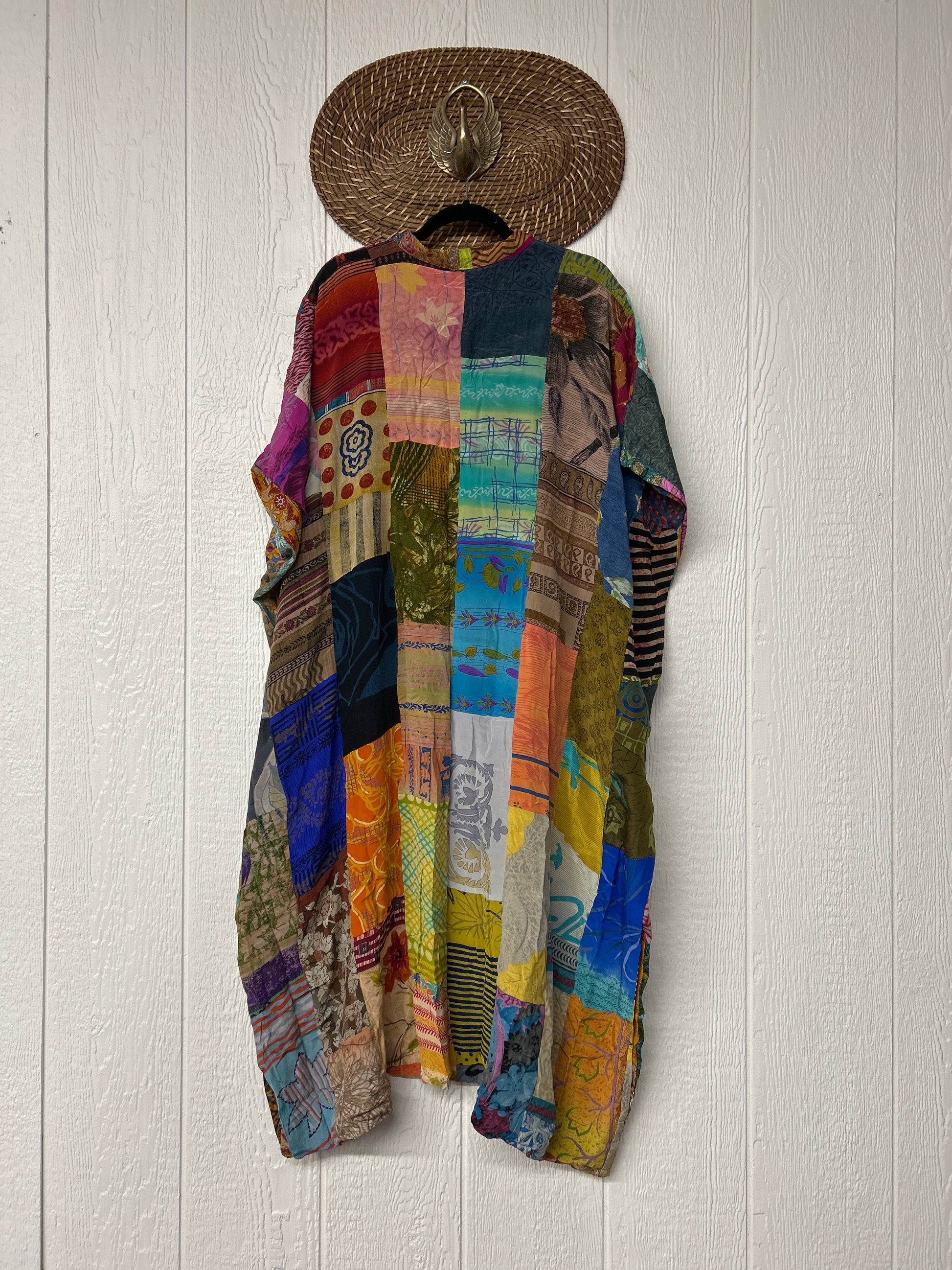 Patchwork outer garment is made from upcycled vintage rasgulla and crepe and fully lined in printed cotton sari. Features slouchy outer pockets, a v neckline and side slits for extra dimension.