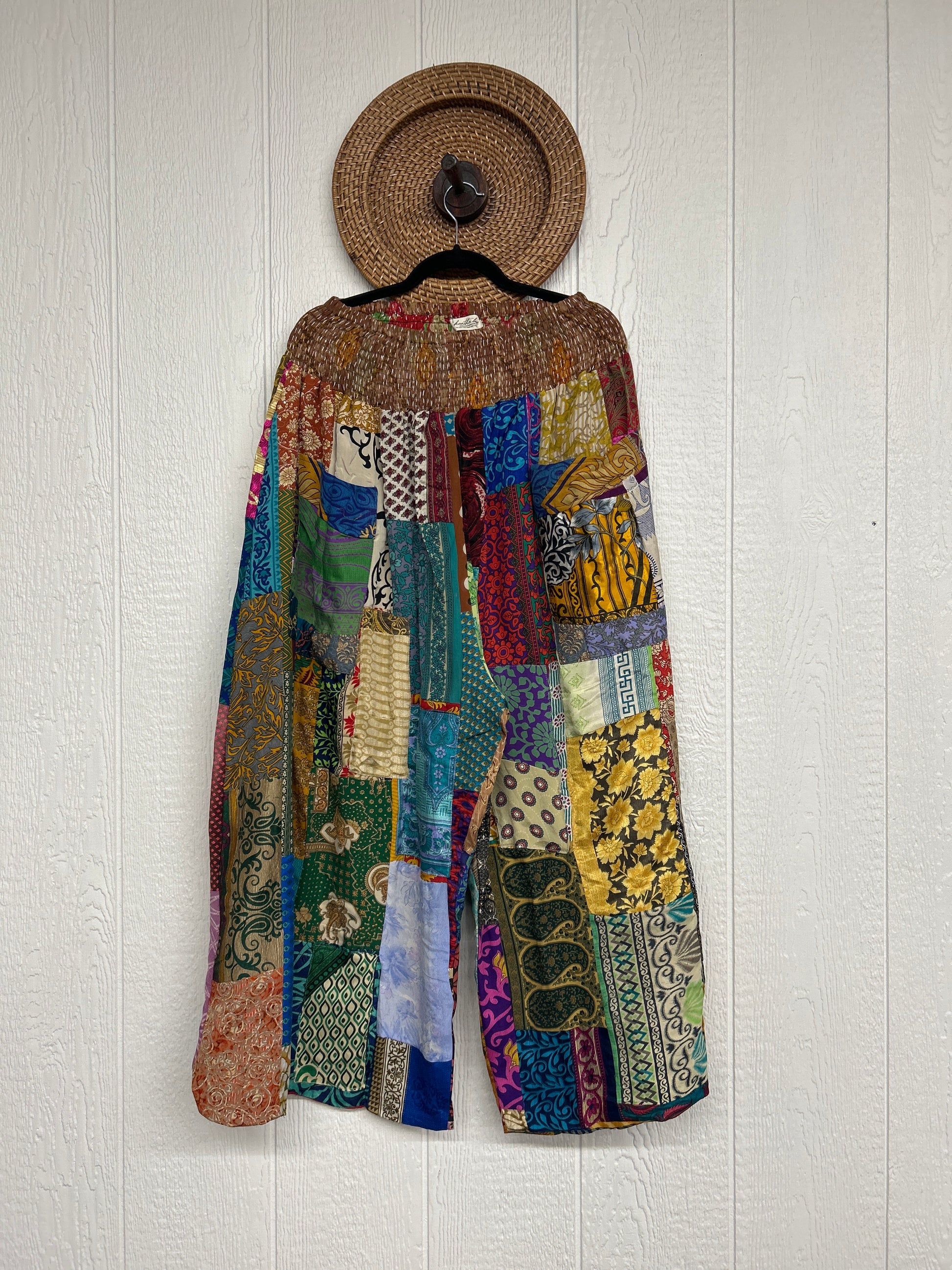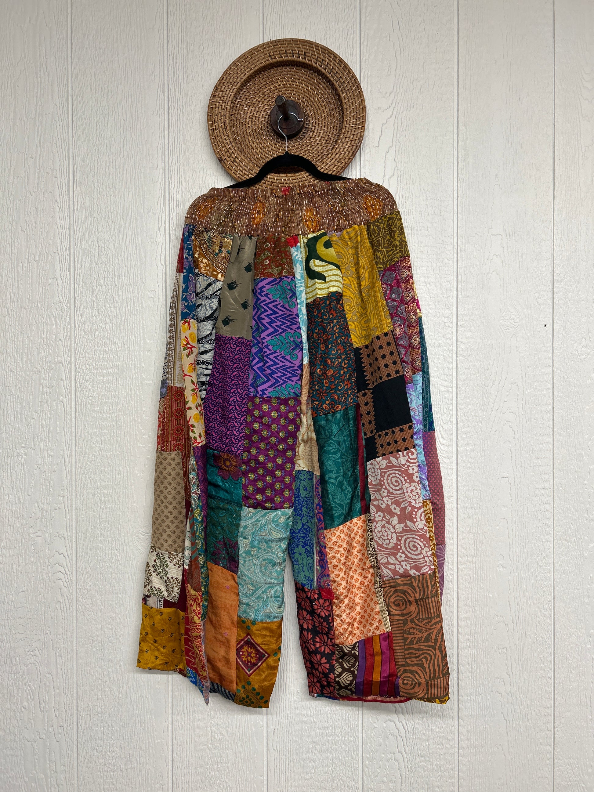 Features super wide legs that make your pants dance when you walk. Front slouchy pockets are deep enough to fill with your treasures. Vintage Rasgulla and Crepe Sari make up the beautiful patchwork featured on the outside with vintage cotton sari lining on the inside. Fully reversible and free size in all the ways!