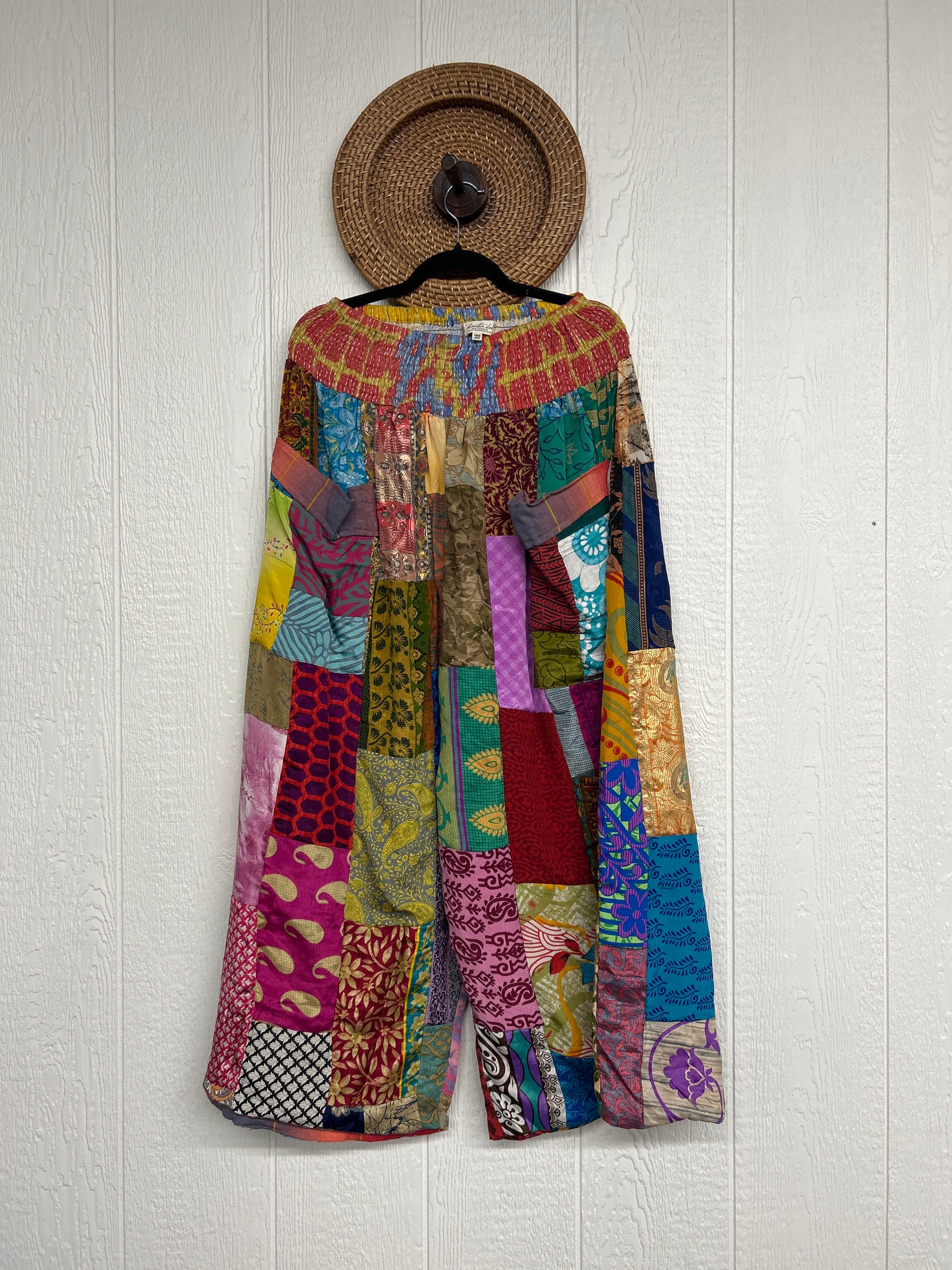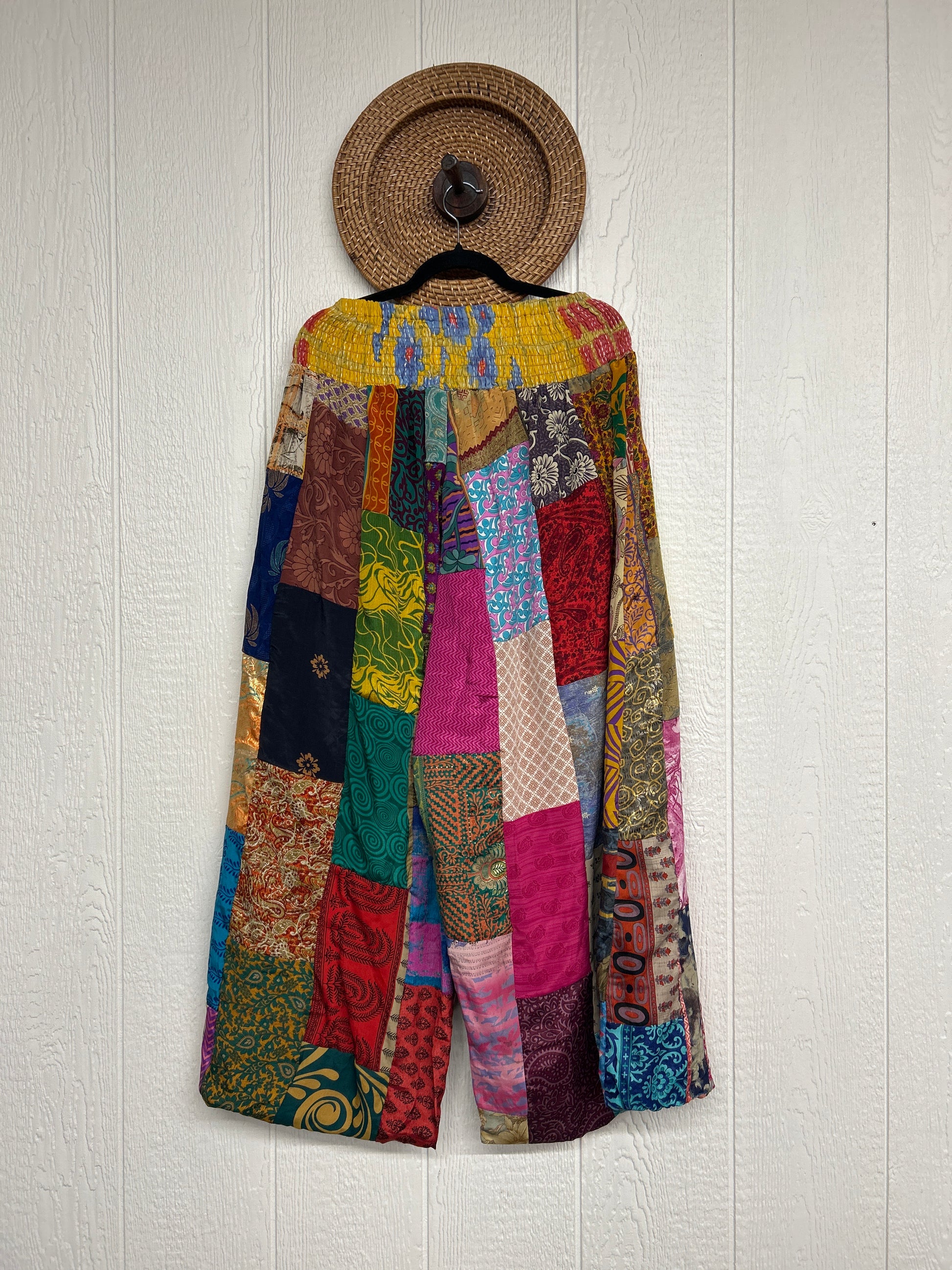 Features super wide legs that make your pants dance when you walk. Front slouchy pockets are deep enough to fill with your treasures. Vintage Rasgulla and Crepe Sari make up the beautiful patchwork featured on the outside with vintage cotton sari lining on the inside. Fully reversible and free size in all the ways!