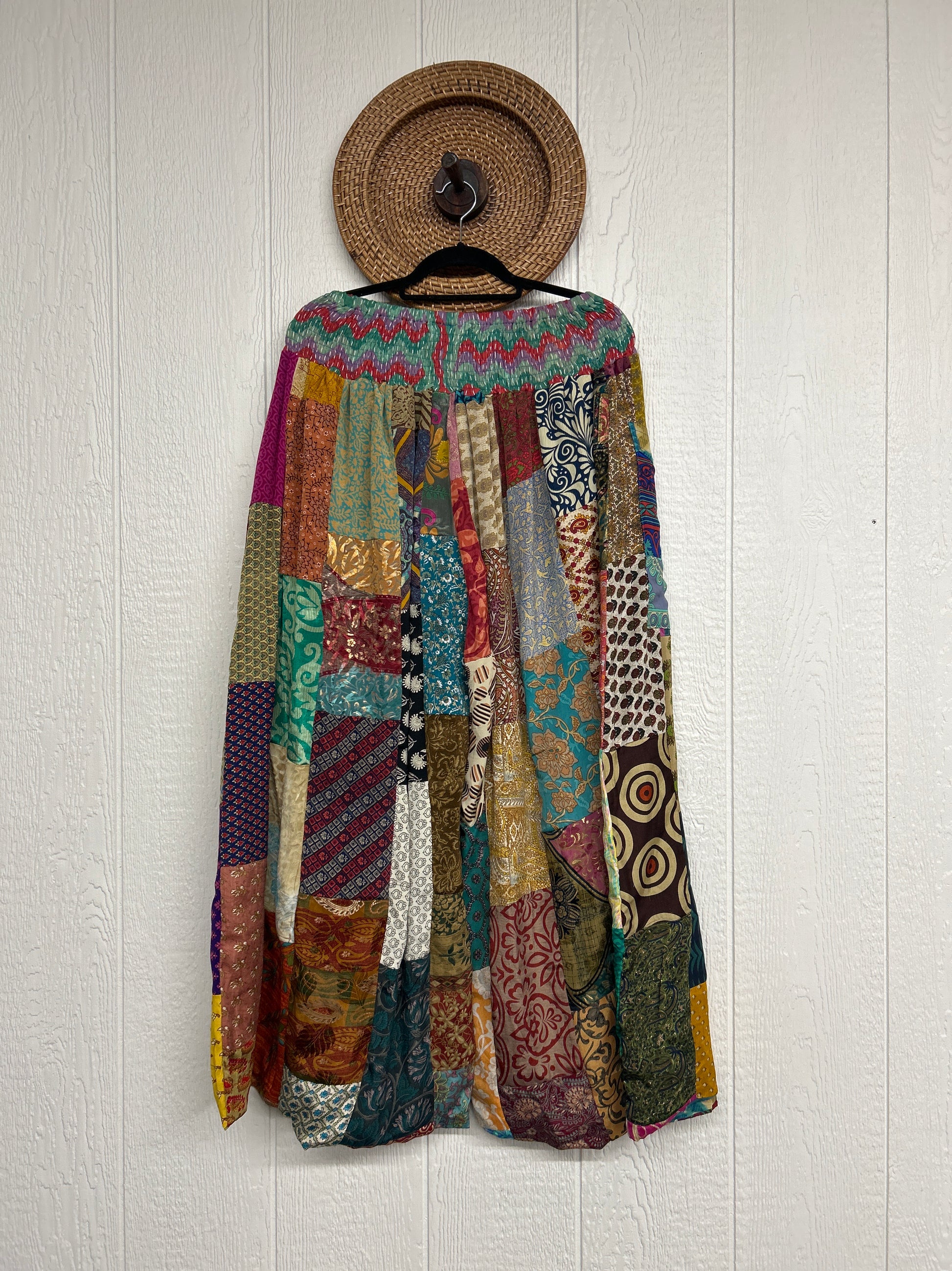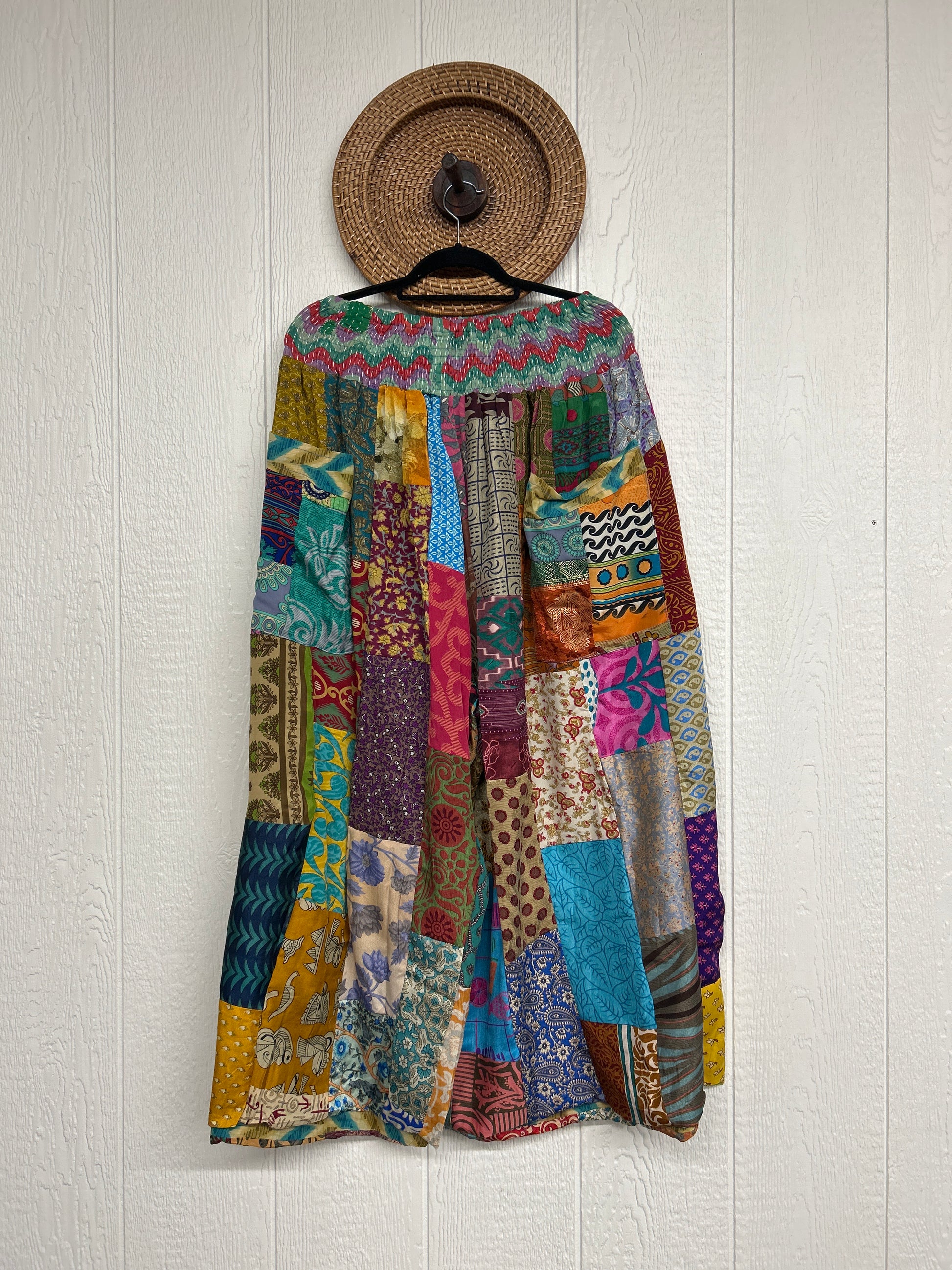 Features super wide legs that make your pants dance when you walk. Front slouchy pockets are deep enough to fill with your treasures. Vintage Rasgulla and Crepe Sari make up the beautiful patchwork featured on the outside with vintage cotton sari lining on the inside. Fully reversible and free size in all the ways!