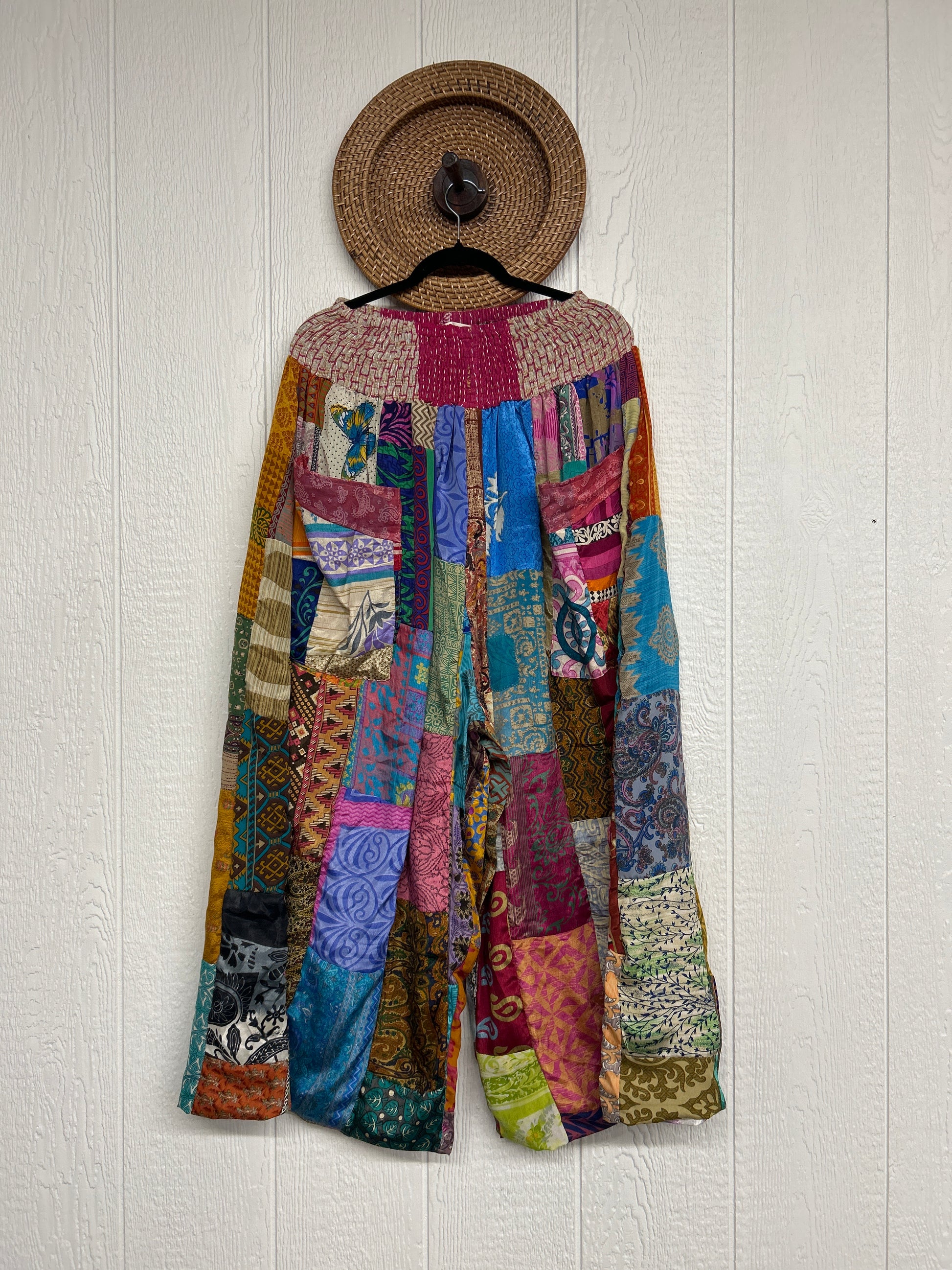 Features super wide legs that make your pants dance when you walk. Front slouchy pockets are deep enough to fill with your treasures. Vintage Rasgulla and Crepe Sari make up the beautiful patchwork featured on the outside with vintage cotton sari lining on the inside. Fully reversible and free size in all the ways!