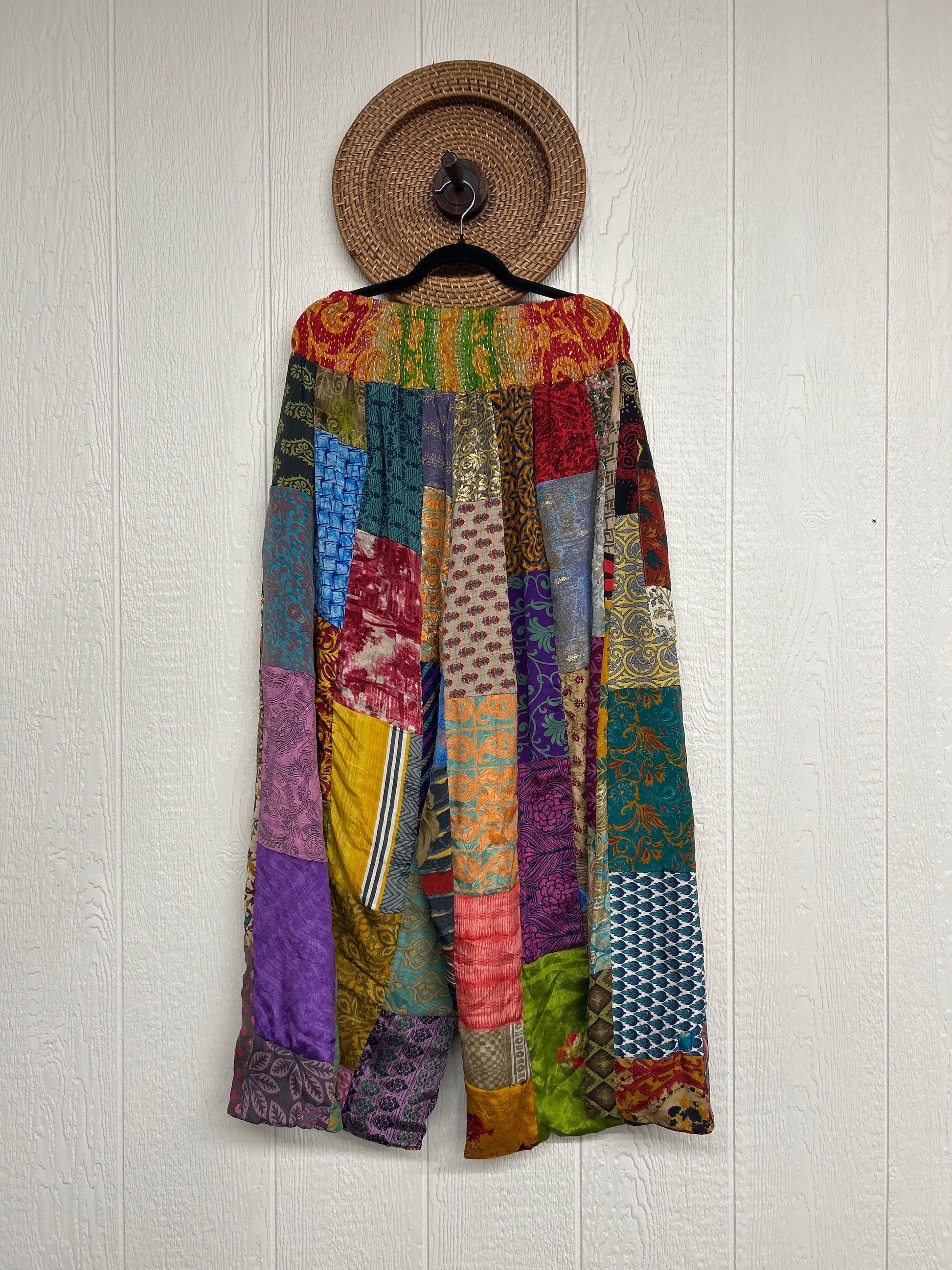 Features super wide legs that make your pants dance when you walk. Front slouchy pockets are deep enough to fill with your treasures. Vintage Rasgulla and Crepe Sari make up the beautiful patchwork featured on the outside with vintage cotton sari lining on the inside. Fully reversible and free size in all the ways!