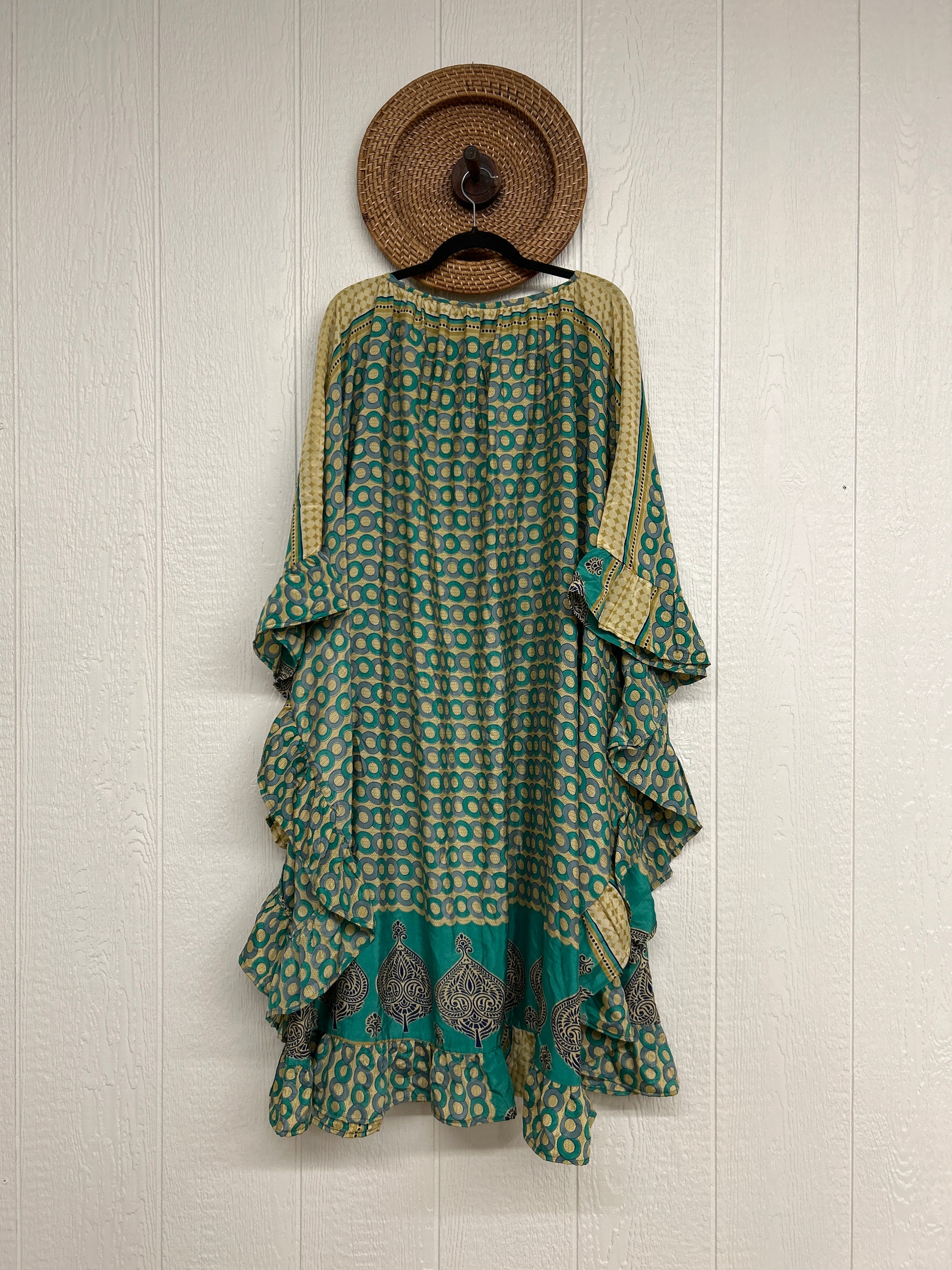 Fabrics may have small threads or holes in the layers. Color inconsistency or small stains may be present. The saris are sewn together and extend the life of each design. Imperfections should be celebrated.